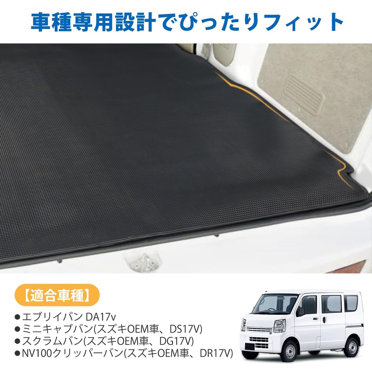 【適合車種】エブリイバン DA17V、ミニキャブバン(スズキOEM、DS17V)、スクラムバン(スズキOEM、DG17V)、NV100クリッパーバン(スズキOEM、DR17V)に対応。※このDA17V ラゲッジマットはリヤシートを格納した状態で使用します。エブリイワゴン、クリッパーリオ、タウンボックス、スクラムワゴンには適合しません。