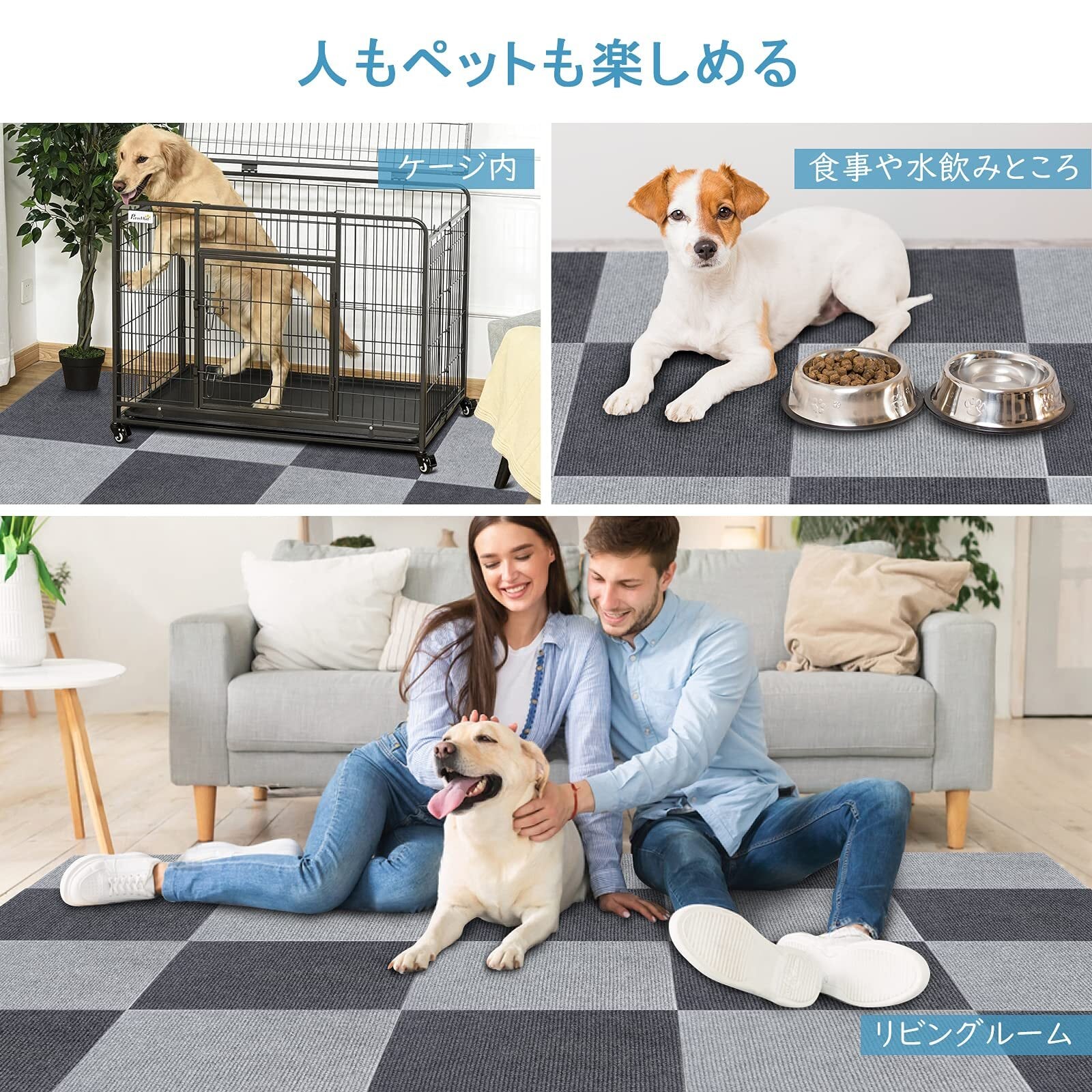 【ずれない 吸着タイルカーペット】空気が抜け真空状態になって無数の吸盤ができたようなくっつく仕組みだから、動き回ってもマットはズレません。厚み約4mmのマットですので、つまずきにくく、扉の開閉の妨げにもなりません。引っ掛かったりする恐れが少なくなる。高齢者や老犬は足腰が弱くなり、滑り止め対策として良いものです。