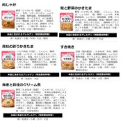 【すき焼き】1袋(100g)当たり;エネルギー93Kcal,たんぱく質5.1g,脂質4.3g,炭水化物8.6g,食塩相当量1g<br>【貝柱の彩りかきたま】1袋(100g)当たり;エネルギー35Kcal,たんぱく質3.3g,脂質1.4g,炭水化物2.5g,食塩相当量0.9g<br>【海老と貝柱のクリーム煮】1袋(100g)当たり;エネルギー95Kcal,たんぱく質3.8g,脂質5.6g,炭水化物7.8g,食塩相当量0.7g<br>【鮭と野菜のかきたま】1袋(100g)当たり;エネルギー65Kcal,たんぱく質3.6g,脂質1.9g,炭水化物9.4g,食塩相当量0.8g<br>【肉じゃが】1袋(100g)当たり;エネルギー80Kcal,たんぱく質3.1g,脂質3g,炭水化物11.2g,食塩相当量0.7g