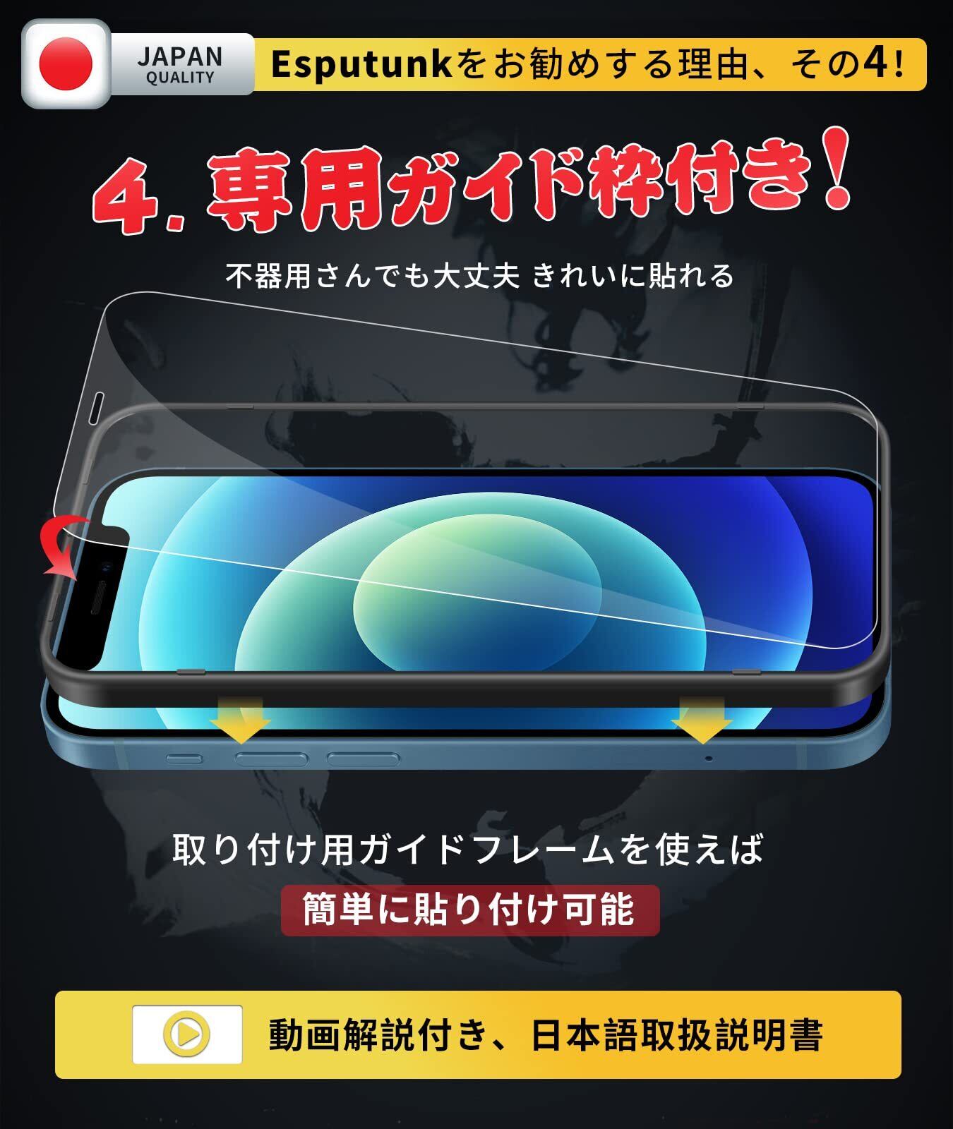 必ずお読みください「注意喚起」本製品は【iPhone12 Pro対応ガラスフィルム+カメラフィルム+ガイド枠】4枚セットです。全面保護を提供いただき、別に買うために行く必要はございません。ご希望の数は在庫数上の場合はどうぞ弊店にてお問い合わせください。【Esputunk製品の概要】:永久について、製品に不具合が生じた場合は、お客様からのお問い合わせ内容に応じて代替品交換・返金対応を提供致します。(お一人様につき1回限り)
