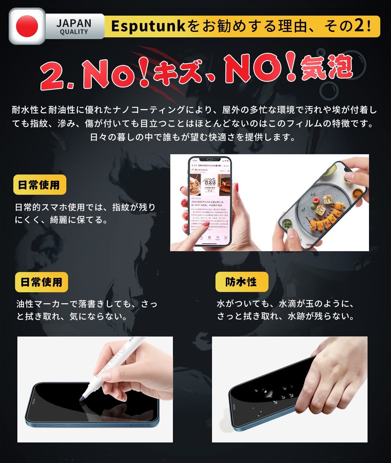 【指紋防止・撥水撥油!貼り付け失敗はゼロ・ガイド枠付き】:指紋や汚れに対する特殊ドコーティング済み、普通のガラスより指紋が残りにくく、疎油層と組み合わせ、いつでも美しい画面で滑らかで快適な操作ができます。専用の貼り付けガイド枠が同梱されています。ガイド枠を利用することで、初心者でも簡単に貼り付けます。すべての失敗の発生を防ぐことができて、ご心配を完全に解消します!グレードアップしたイオン自働吸着技術を採用して、初心者でもたった3ステップ、10秒で簡単に綺麗で貼り付けることができます!