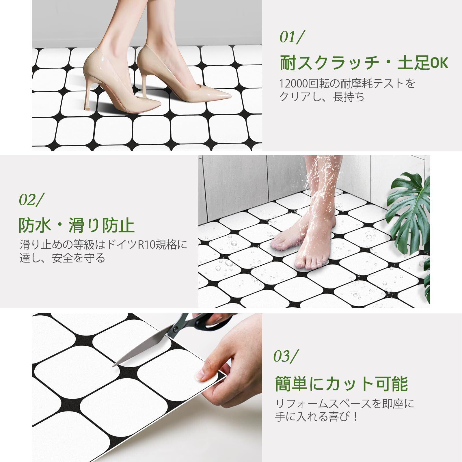 素材の利点:1) 100%防水&抗菌防カビで、滑り止めの等級はドイツR10規格に達しており、洗面所、トイレ、キッチン、玄関、廊下、リビングルームなど、あらゆる床面に安心して使用できます。2) 12000回転の耐摩耗テストをクリアし、土足OK、長持ち。3) 床暖房にも対応しており、光滑で平らな面にも使用できます。4) 湿った雑巾で簡単に綺麗にします、簡単な手入れ。5) SGS認証の四大品質試験に合格し、安全で環境に優しい素材です。