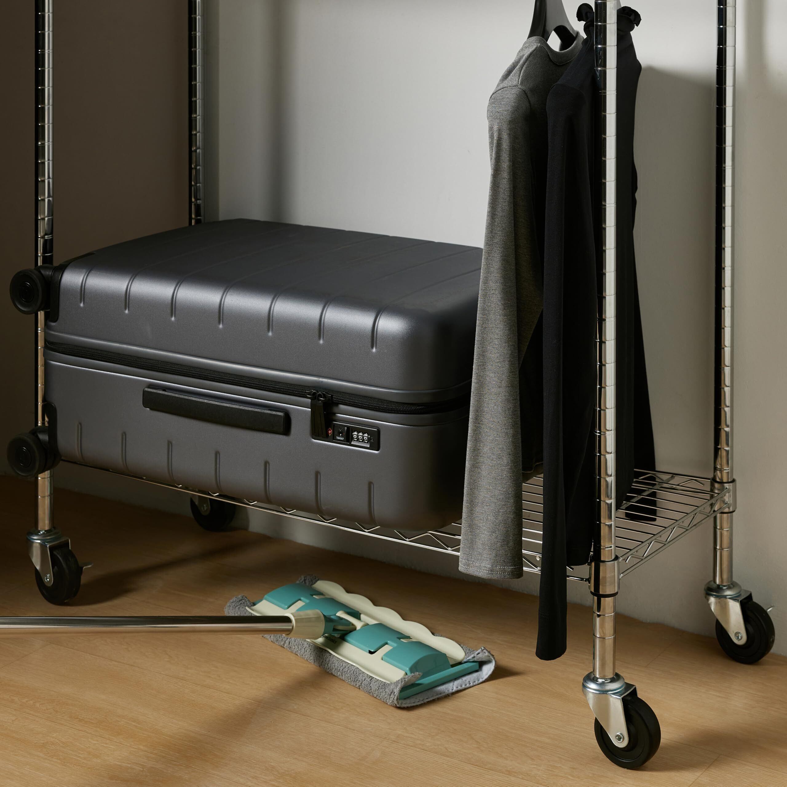 丈夫なスチール製。キャスター (うち2個にストッパー付き) 付きで部屋内の移動も簡単