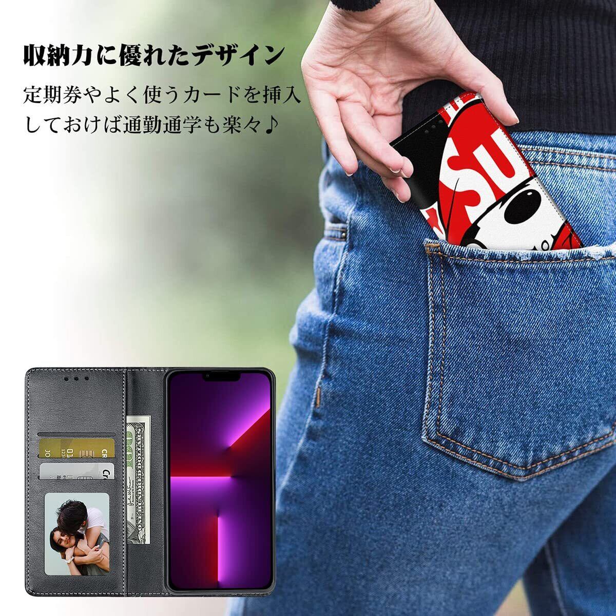 【3.機能満載の手帳型ケース】 このケースには、横置きスタンド機能が付いていますので、好みの角度で動画鑑賞や読書などを楽しむことができます!また、内部には3つのカード入れとフリーポケットがあるので、名刺や定期券の収納に最適です!便利さと実用性を兼ね備えた手帳型ケースです!✨✨