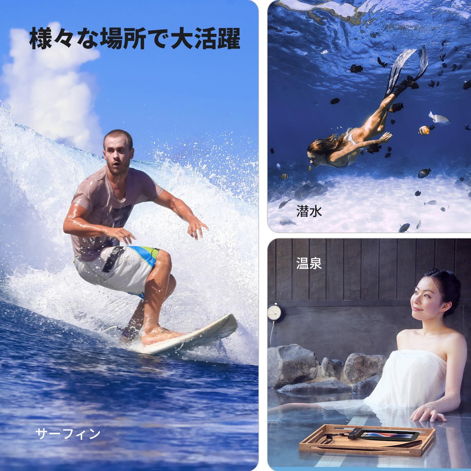 【様々な場面に不可欠&7.2インチ以内スマホに対応】7.2インチ以内スマホに対応可能。iPhone15/iPhone14/plus/pro/pro max/13/mini/iPhone 12 /mini/Pro/Max/11pro/11/XS/XR/X/8 plus/7/7plus/6s/6/6plus/5/5s /se3 第三世代、Galaxy、Xiaomi Redmi Note 8 9 10 pro mini、huawei P20/P30 lite、Xperiaなど。アウトドア、スポーツ、旅行の必需品・防水、防塵、防汚に不可欠。海、プール、キッチン、お風呂、海辺、温泉、スキー、野外ライブ、釣り、次の旅などいろいろなシーンで大活躍。パスポート、鍵、カード、現金なども収納でき、小物管理にも防菌対策にも役たつ【ご注意:手帳型ケースのような厚いケースをつけているまま防水ケースを利用するのはお勧めしません。】