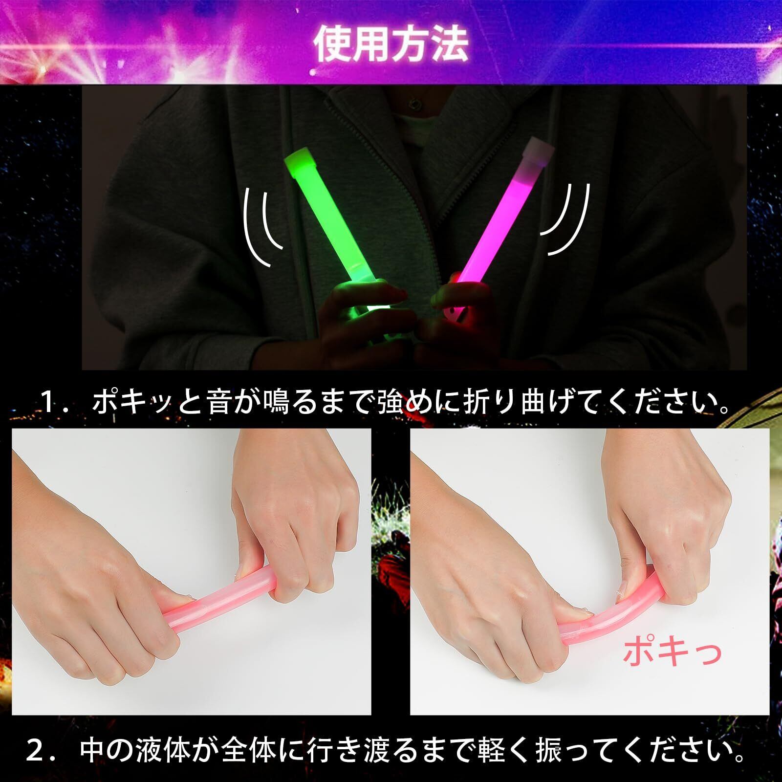 使用方法:サイリウムライトをパキッと折って、上下に振るだけで、たちまち華やかな美しい蛍光が出てきます。(夜は蛍光効果がもっと良いです。)