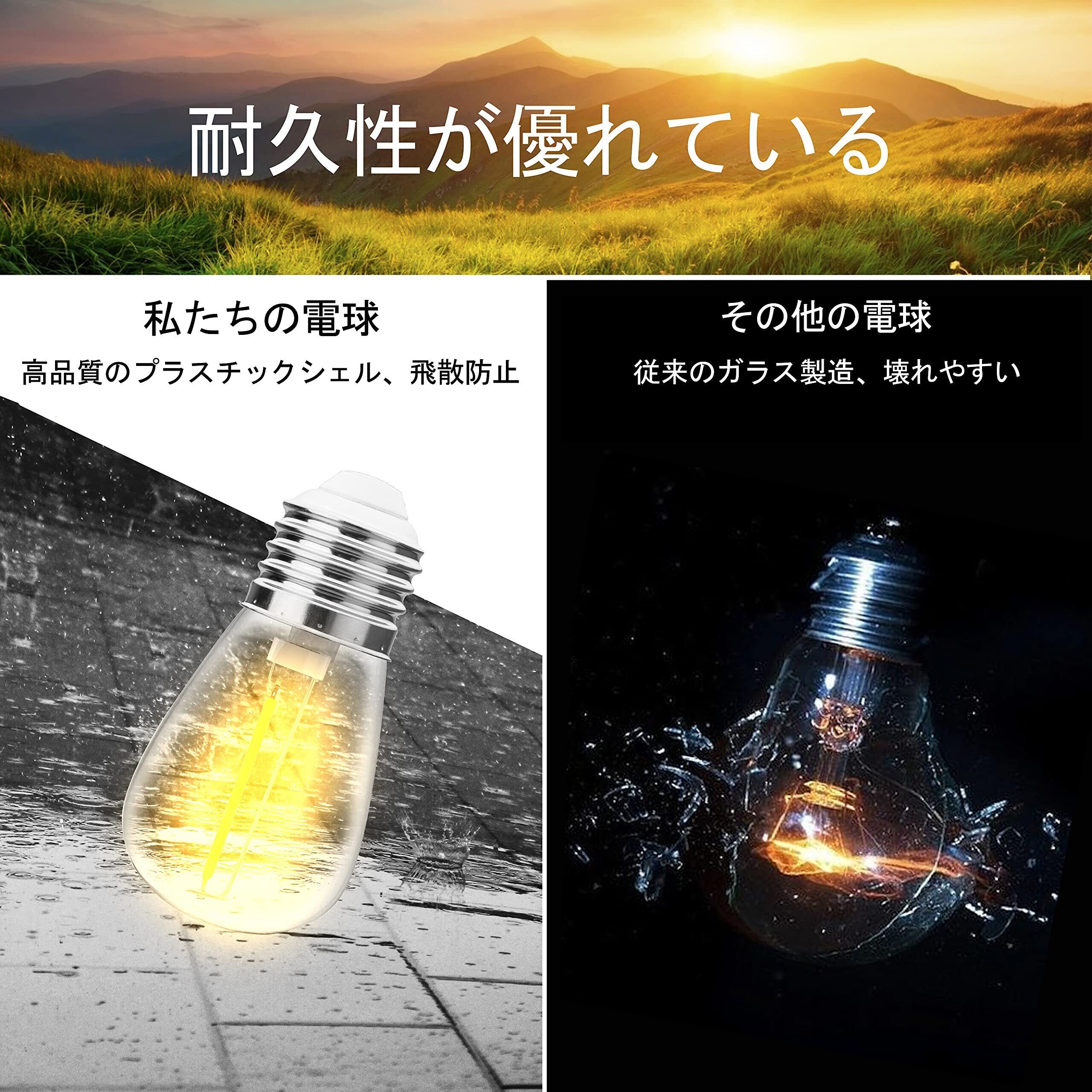 IP65レーティングの防水仕様なので、これらのストリングライトはあらゆる天候条件でうまく機能し、庭、裏庭、パティオ、バルコニー、その他の屋外または屋内スペースを明るくするのに最適です。