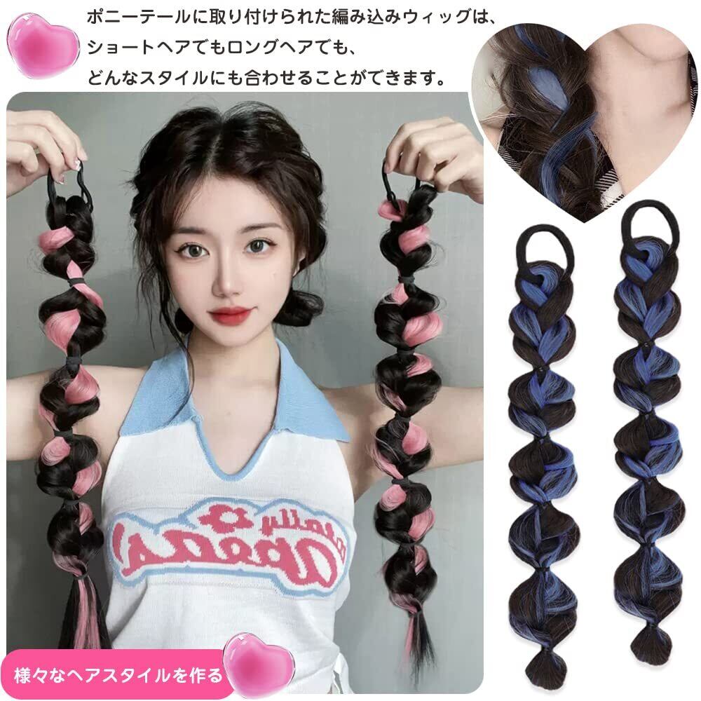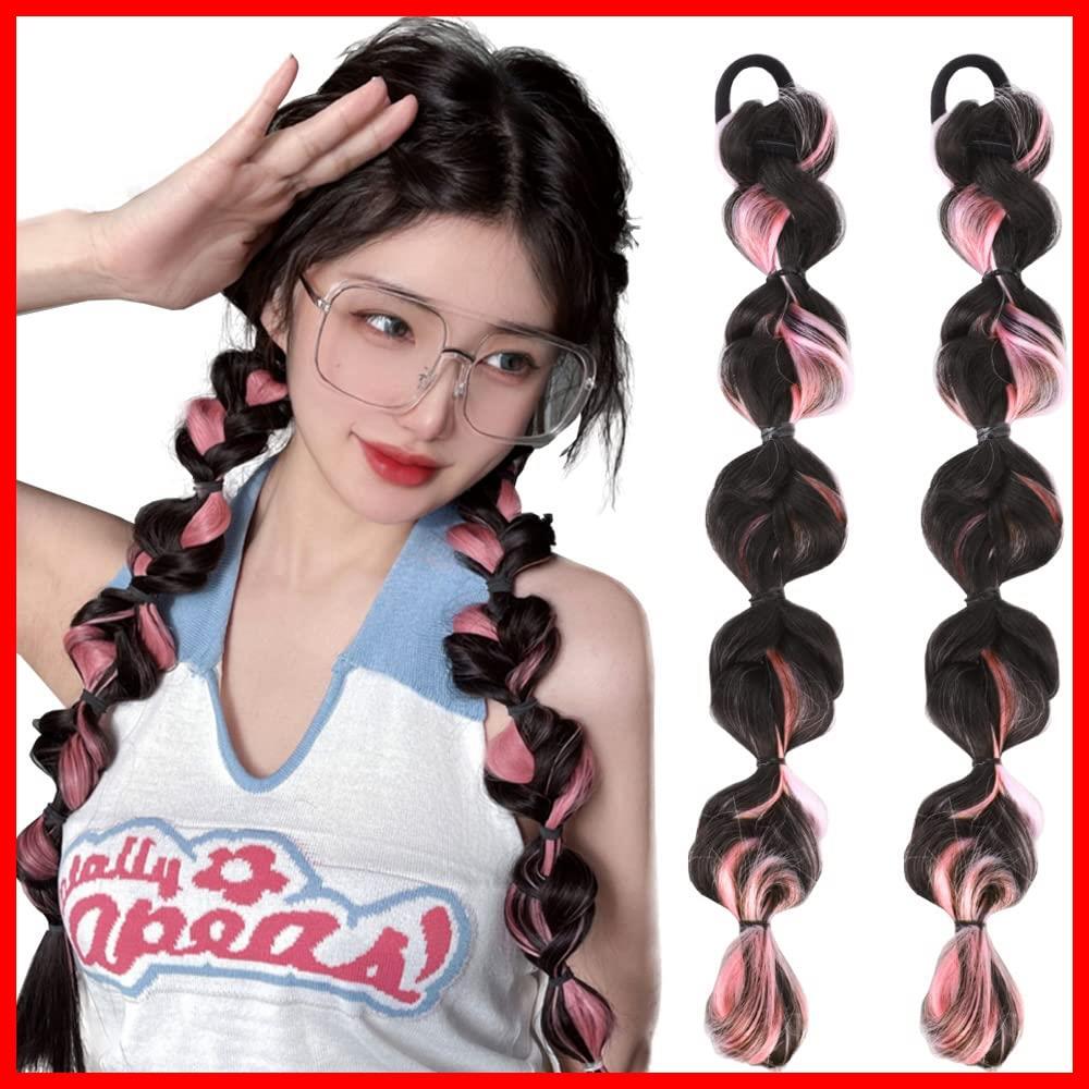 ヘアエクステ 三つ編み ウィッグ 2個セット 取り付け簡単 カラーエクステ 編み込み 髪の毛 ポニーテール 延長 ツインテール デュアルテール 自然 おしゃれ 着脱簡単 少女 レディース 発表会 イベント フェス パーティー 誕生日会 子供 大人 (櫻のピンク) | ニコニコshops