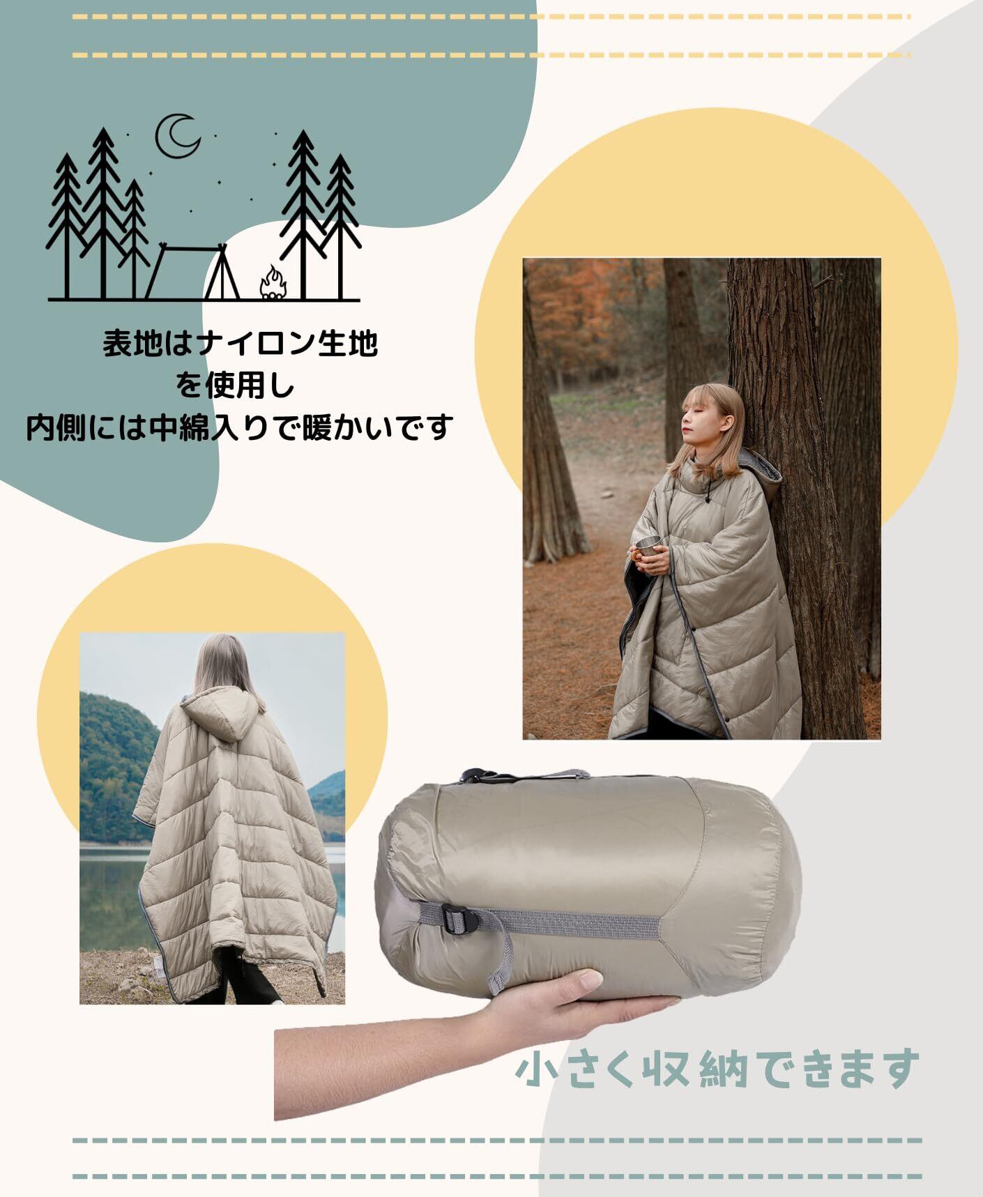 ポンチョ時は真冬用ではないですが肌寒い時に最適な薄さで 軽くて動き易く、まさに動けるシェラフです。 帽子付きでさらに防寒対策もバッチリ。軽量かつ保温性も備えており、表地はナイロン生地を使用し 内側には中綿が入っており暖かいです。