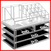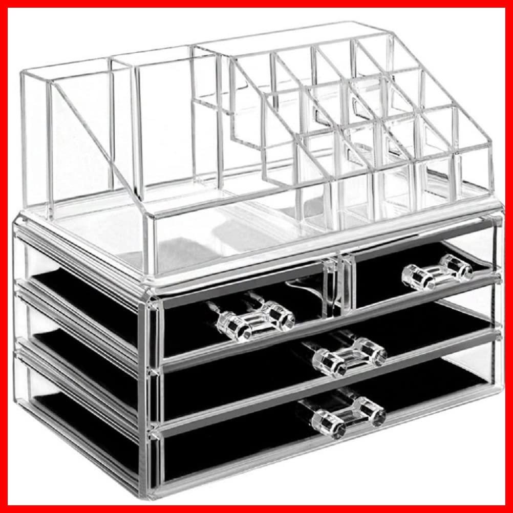 【コスメ収納】上段(大きさの異なる仕切り)と下段(大きさの異なる引き出し)の部分で構成されているので、セットでの使用は勿論、分けて使用することも出来ます。スキンケア製品、口紅、マニキュア、アイライナー、ネイルカラー、メイクブラシ、チーク、アイブロウ、スティックファンデーション、美容グッズ、ネックレスや指輪など、その他いろいろな小物、コスメ用品を収納できます。