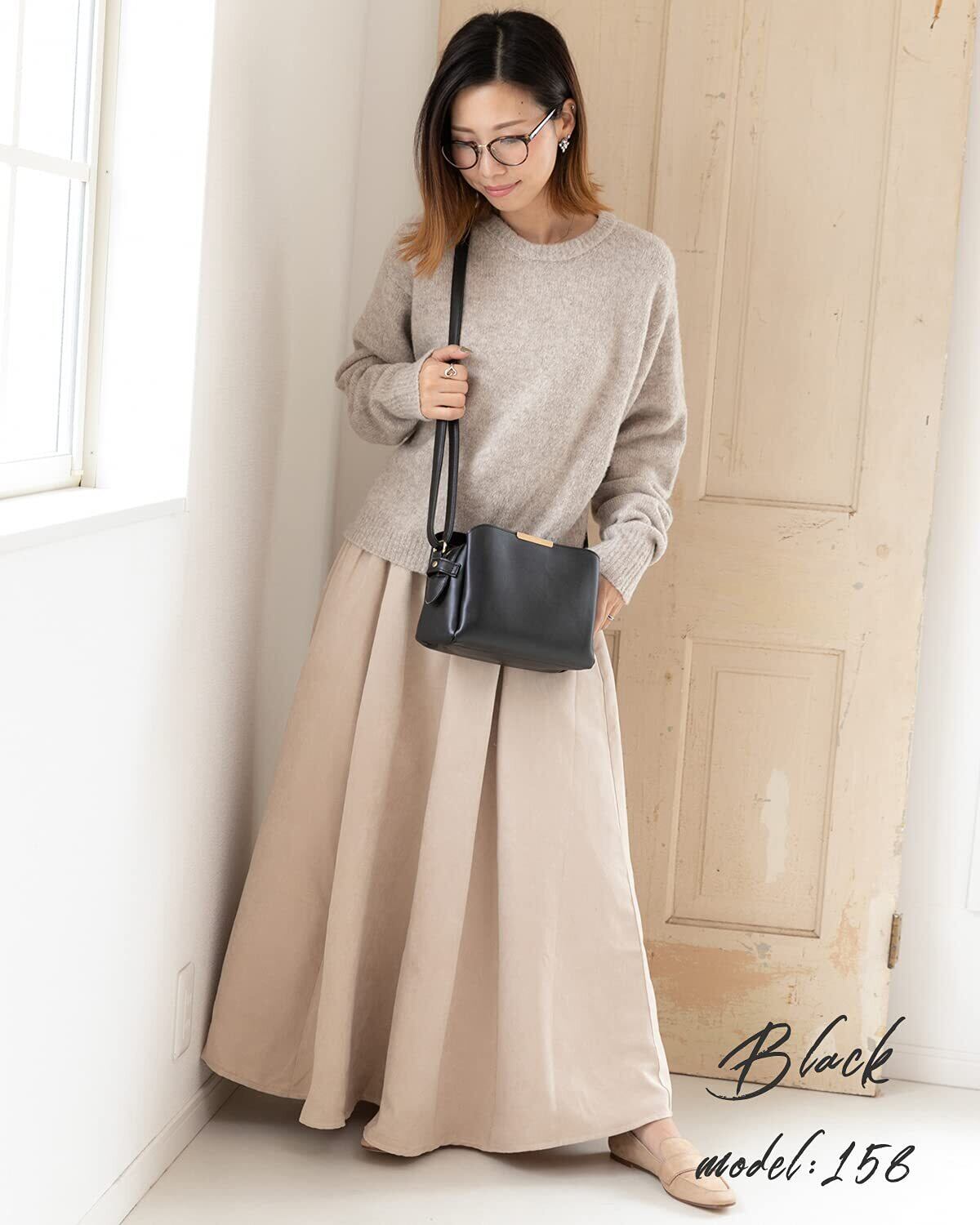 メイン収納のほかに前後にあおりポケットがあるのでバッグの中がキレイに収納できるのもポイント。お財布・スマホ・コスメポーチ・ハンカチなどお出かけに必要な最低限の持ち物がしっかり入るので女子には嬉しいサイズです◎ 長財布が入るサイズ感も嬉しいポイント。