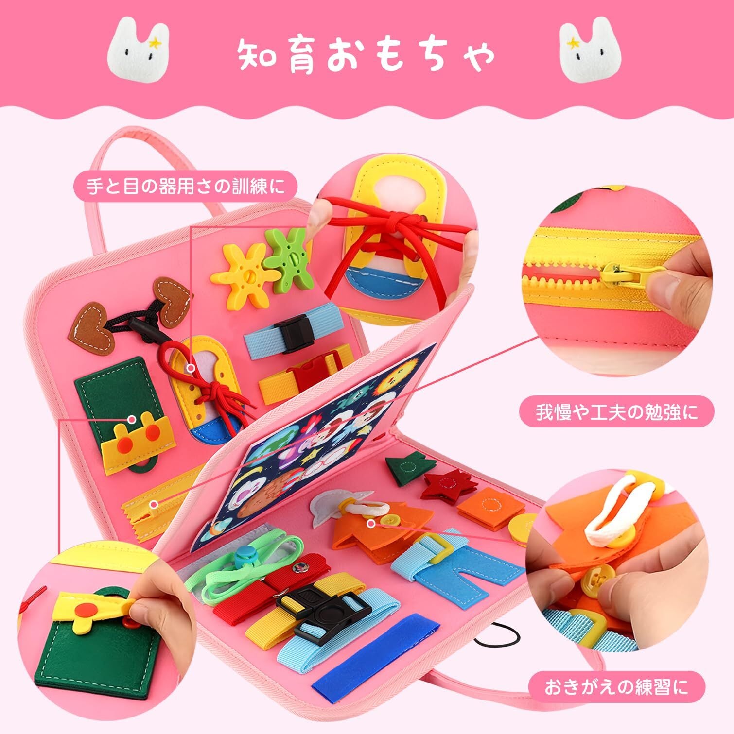 【指先の鍛錬に】細い手や指で簡単に操作できます。手と目の協調を改善し、創造的な思考を発達させます。紐を引っ張ったり、チャックを開けたり、様々な動作が可能で、お子様の問題解決力や探究心を育てます。つなぐ、はずすを繰り返し、指先を動かすことで脳の活性化に繋がります。【お着替えの練習に】衣類のよく使われている留め具、ボタンなどを網羅しており、お子様のお着替えの練習に役立ちます。