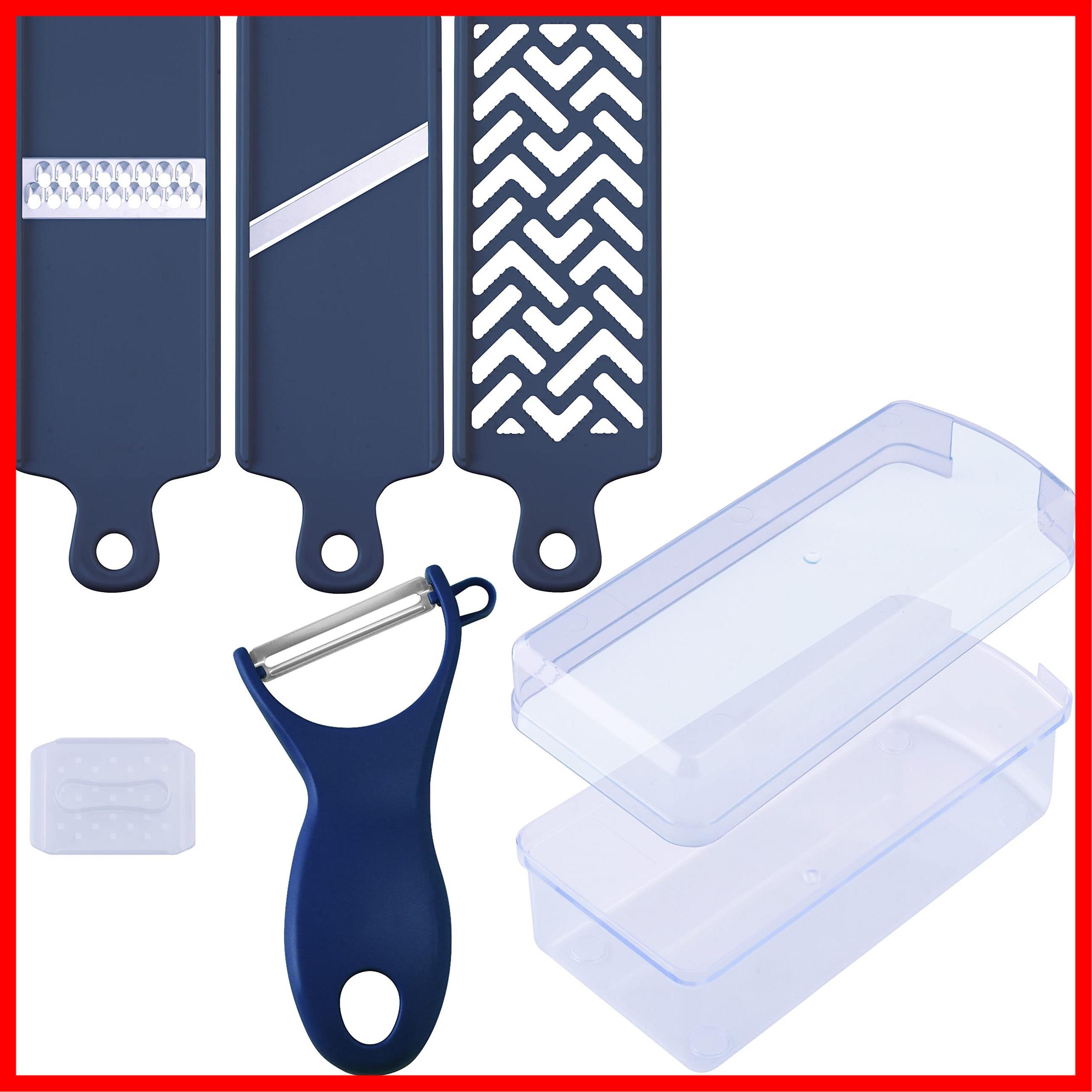 千切り、平切り、おろしのプレート3枚とピーラー、安全ホルダー、ケースとカバーが付いたお買い得7点セット。引出にコンパクトに収まるサイズ感で場所をとりません。
