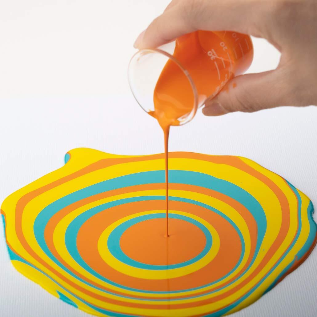 粘度が低く、さらさらとしたメディウムで、絵具が混じり合わずポーリングに適しています。乾燥後は透明になり、ツヤが出ます。
