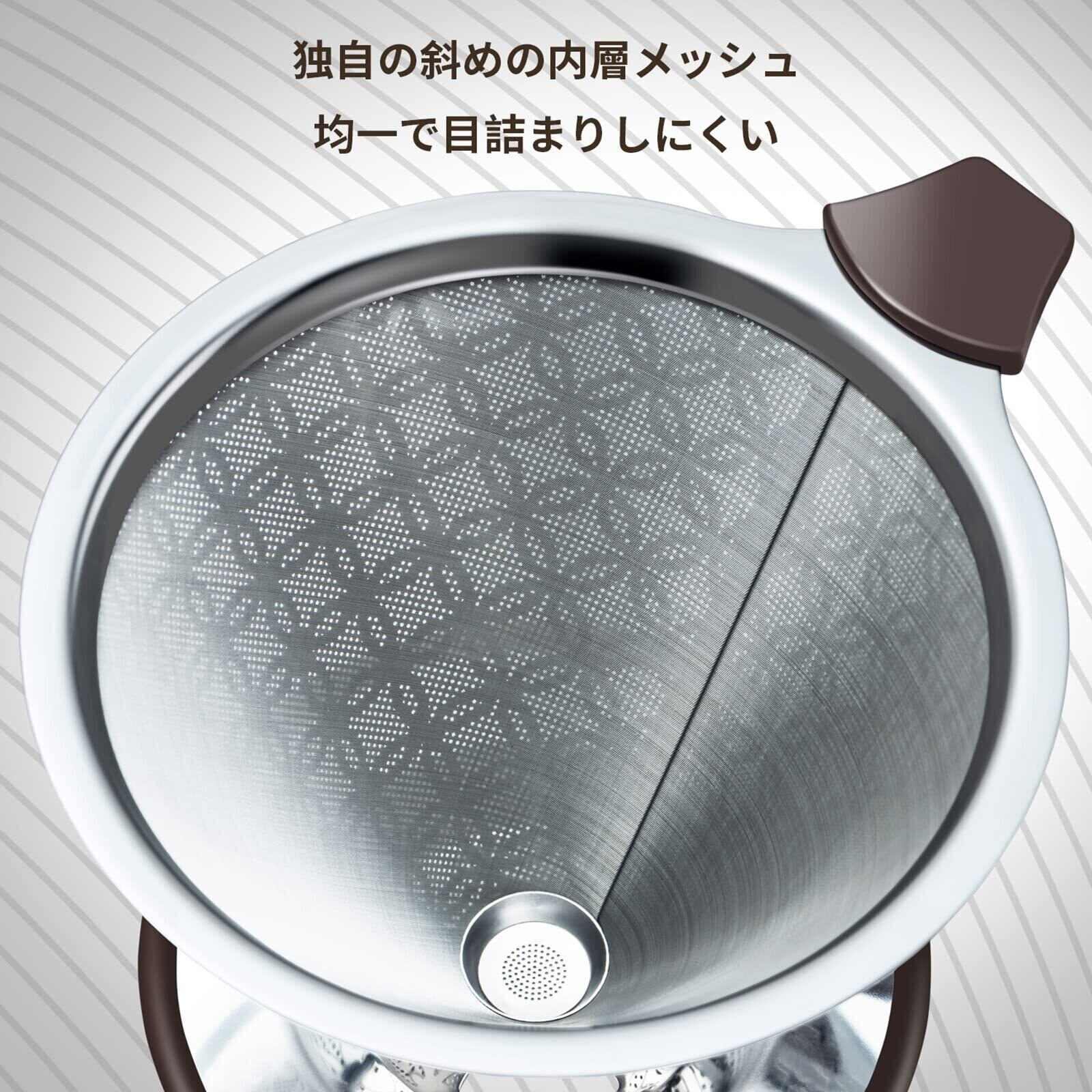 【二層メッシュ】:普通のコーヒードリッパーよりメッシュが細かくて、ほとんど粉末を感じません。
