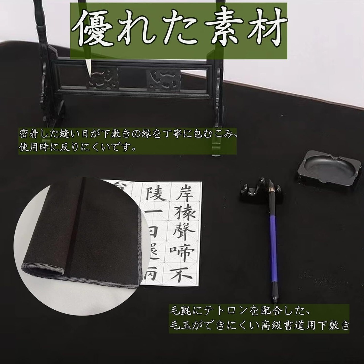 【優れた素材】毛氈にテトロンを配合した、毛玉ができにくい高級書道用下敷き。ブラック色で、墨がついても目立ちません。密着した縫い目が下敷きの縁を丁寧に包むこみ、使用時に反りにくいです。