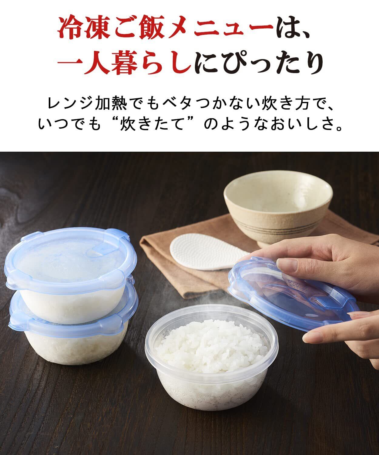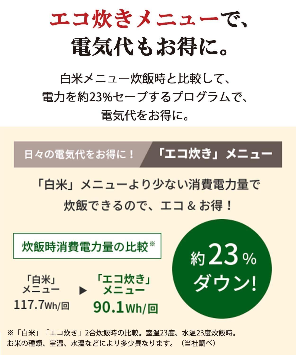 【便利な炊飯機能】エコ炊き:白米メニュー炊飯時に比べて約23%電力ダウン!/早炊き:お茶碗1杯分(0.5合)を約24分で炊きあげ/冷凍ご飯:レンジ加熱でも“炊きたて”のようなおいしさ