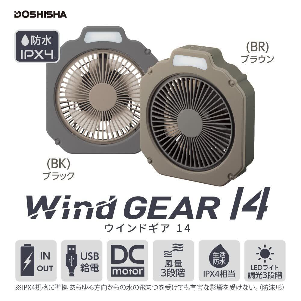 【アウトドアに最適】 ドウシシャ WindGEAR 扇風機 アウトドア向け 14㎝ LEDライト付 防水機能(IPX4) 2電源対応(充電式・USB電源) 風量3段階 収納袋付 ブラック