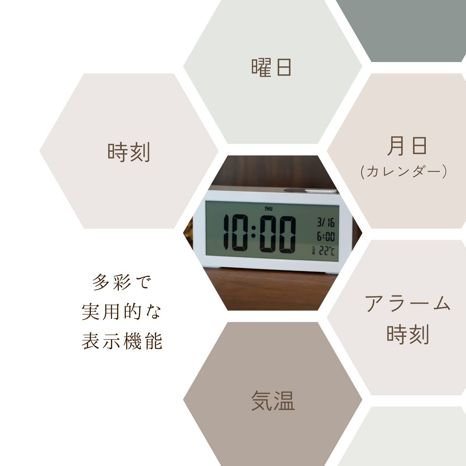 【機能一覧】・目覚まし時計 ・カレンダー・温度計 ・夜間用ライト ・アラーム音量調節