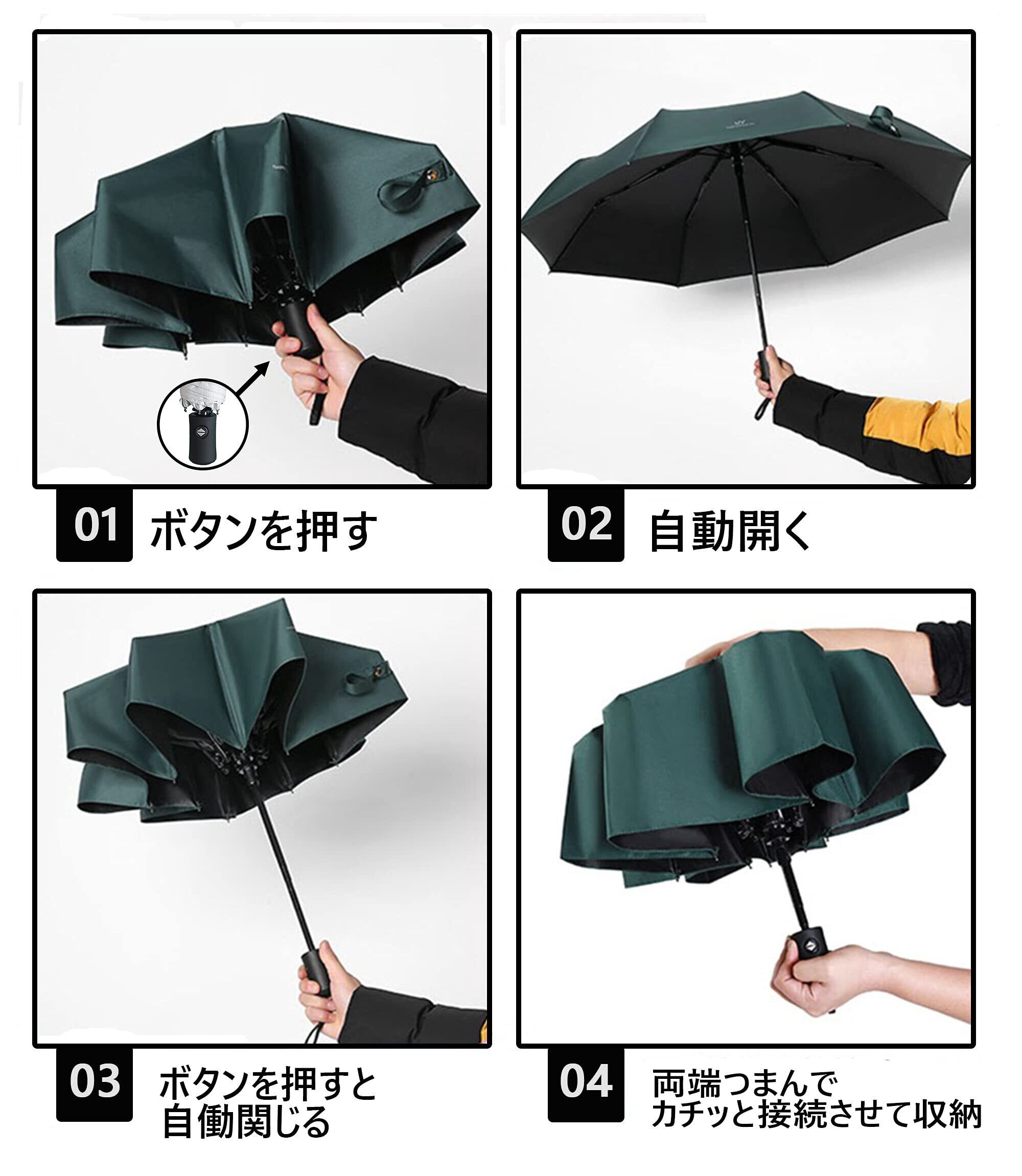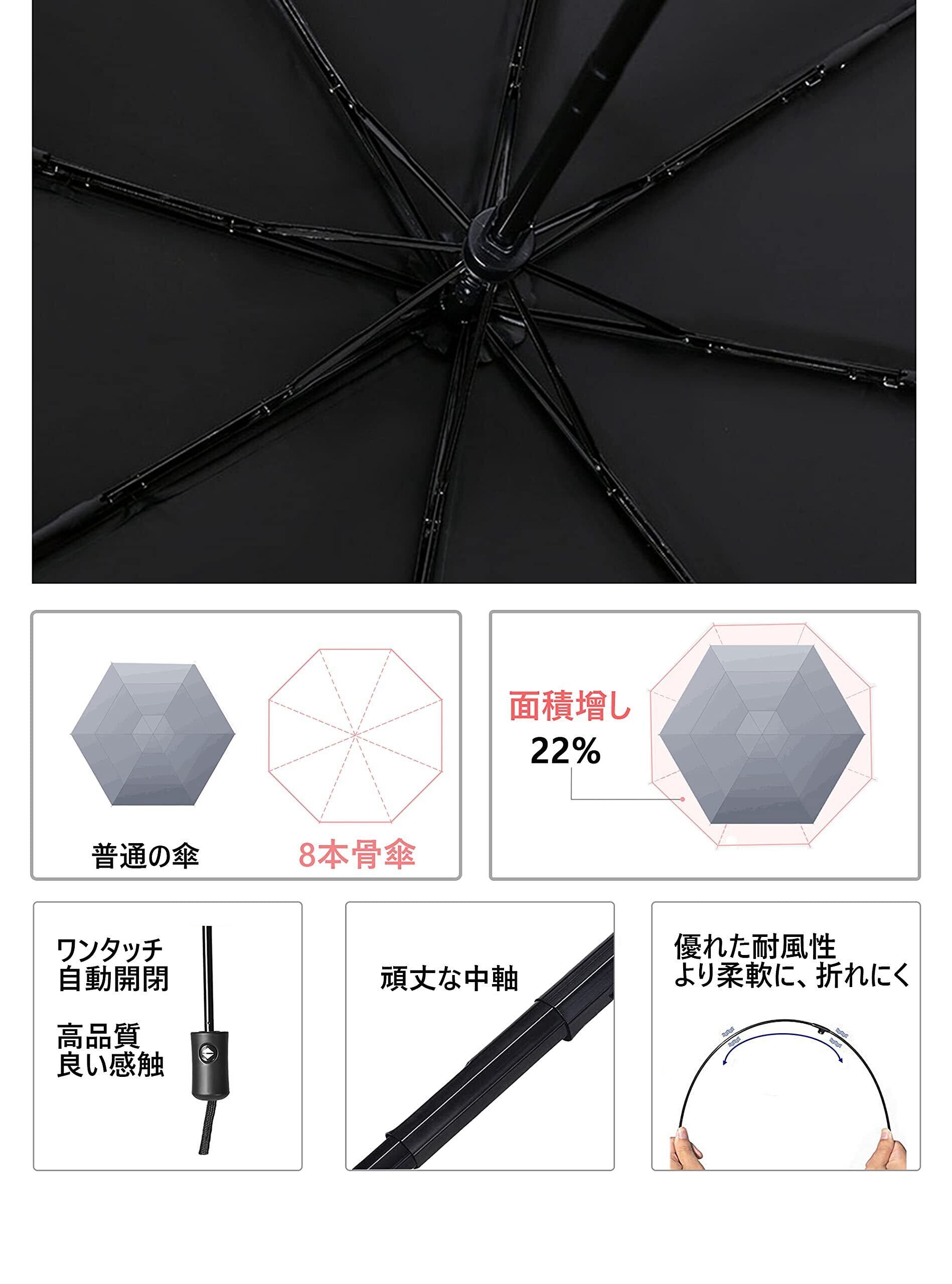 【自動開閉&強風対策】軽く押すと自動開閉できます。車を降りたり、子供を抱いたり、荷物を持っている時、折り畳み傘は最適です。空気力学に基づいて風を受け流す構造で設計されているので、強い風でびっくり返っても元に戻ります。二人で荷物を持って傘に入っても余裕があるほどの大きさですので。梅雨はもちろん、豪雨、強風にも安心できまる8本骨おりたたみ傘です。