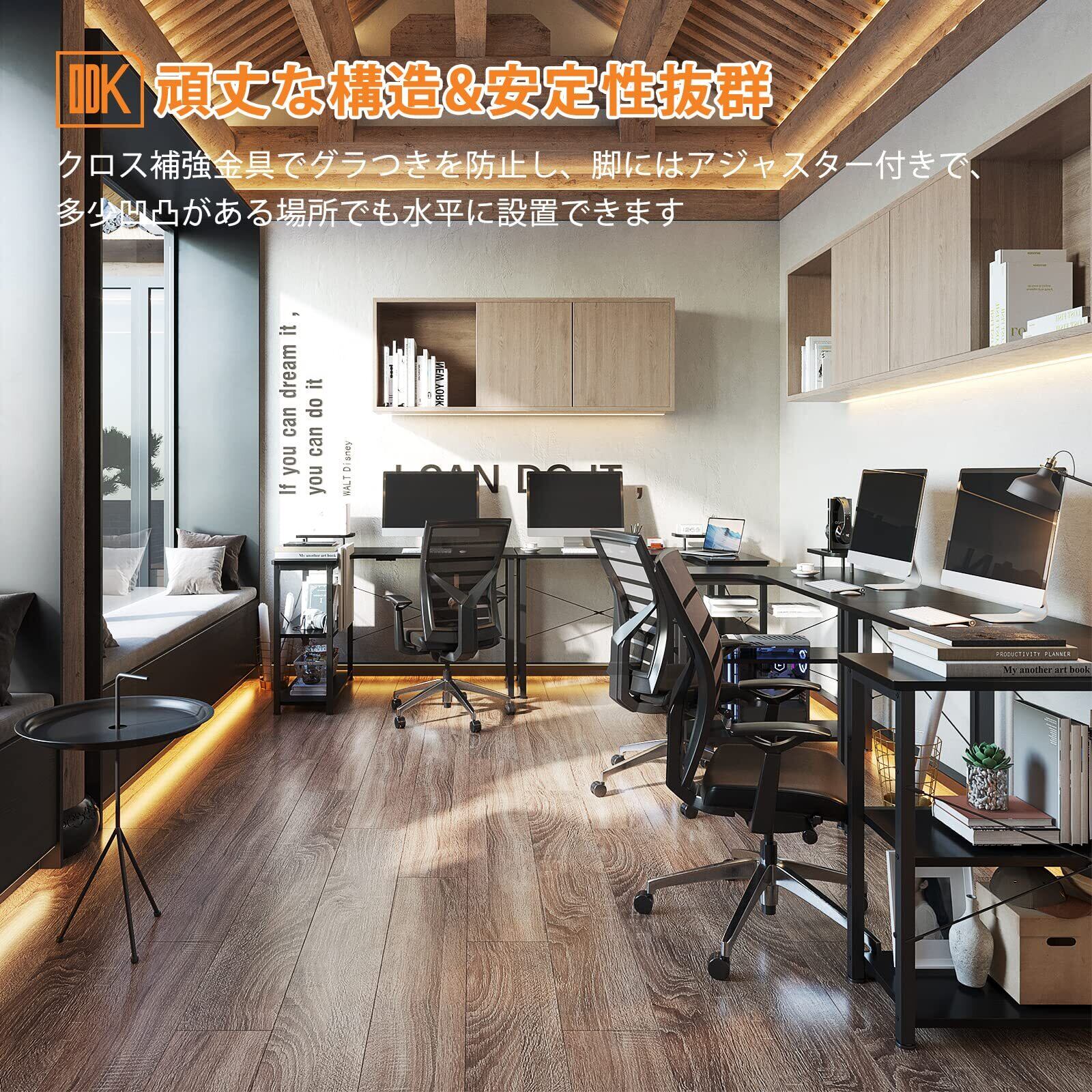【頑丈設計】l字デスクの天板耐荷重は60kg、パソコンや周辺機器を安心に設置できます。天板裏の補強パイプ・横揺れを防ぐクロス補強金具・脚先のアジャスター・強度と耐久性の高いスチールフレームで、ガタつきのないしっかりした使用感を実現しました。