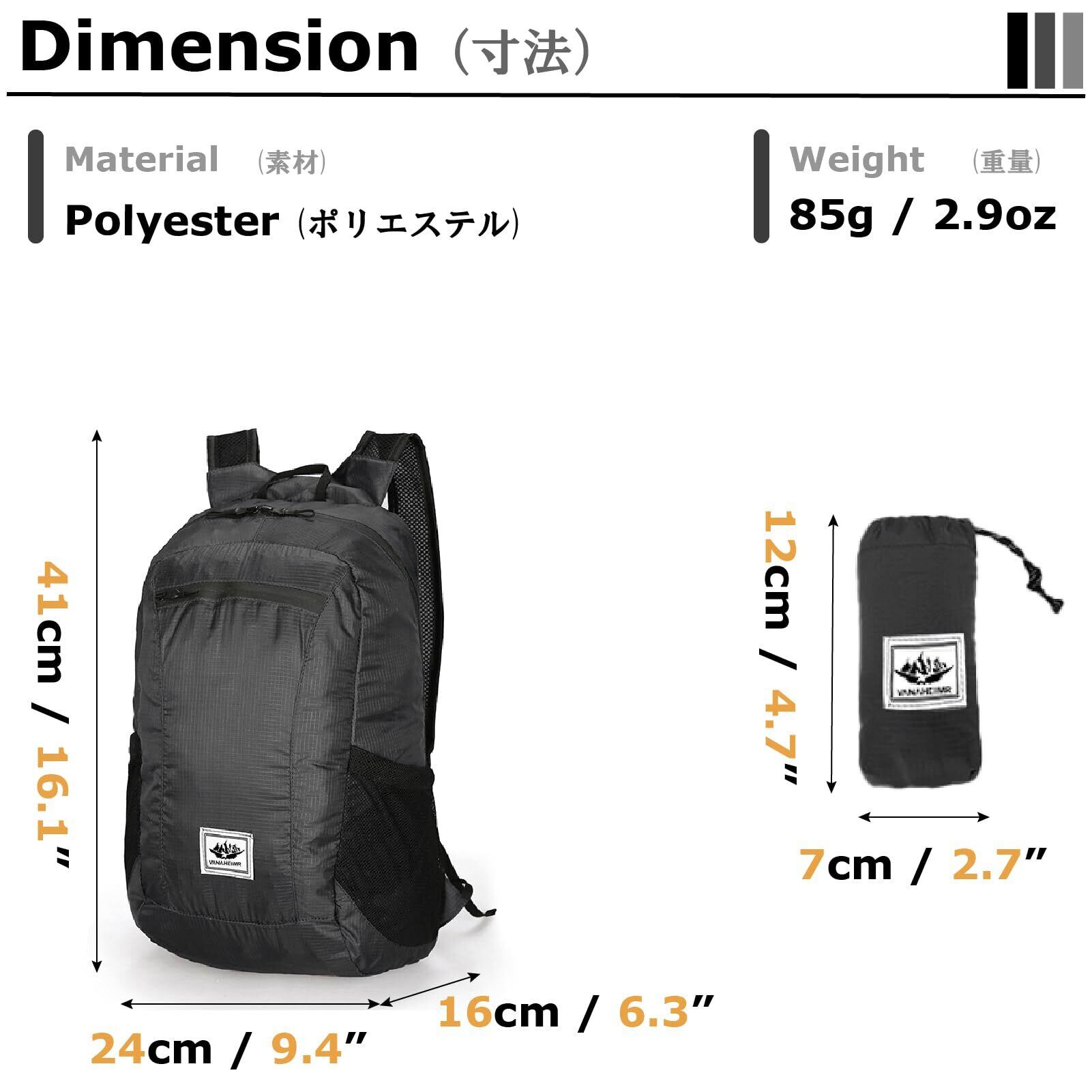 【製品サイズ】アウトドアバックパック展開時:タテ41cm、ヨコ24cm、マチ16cm、収納時:12cm × 7cm、重量85g