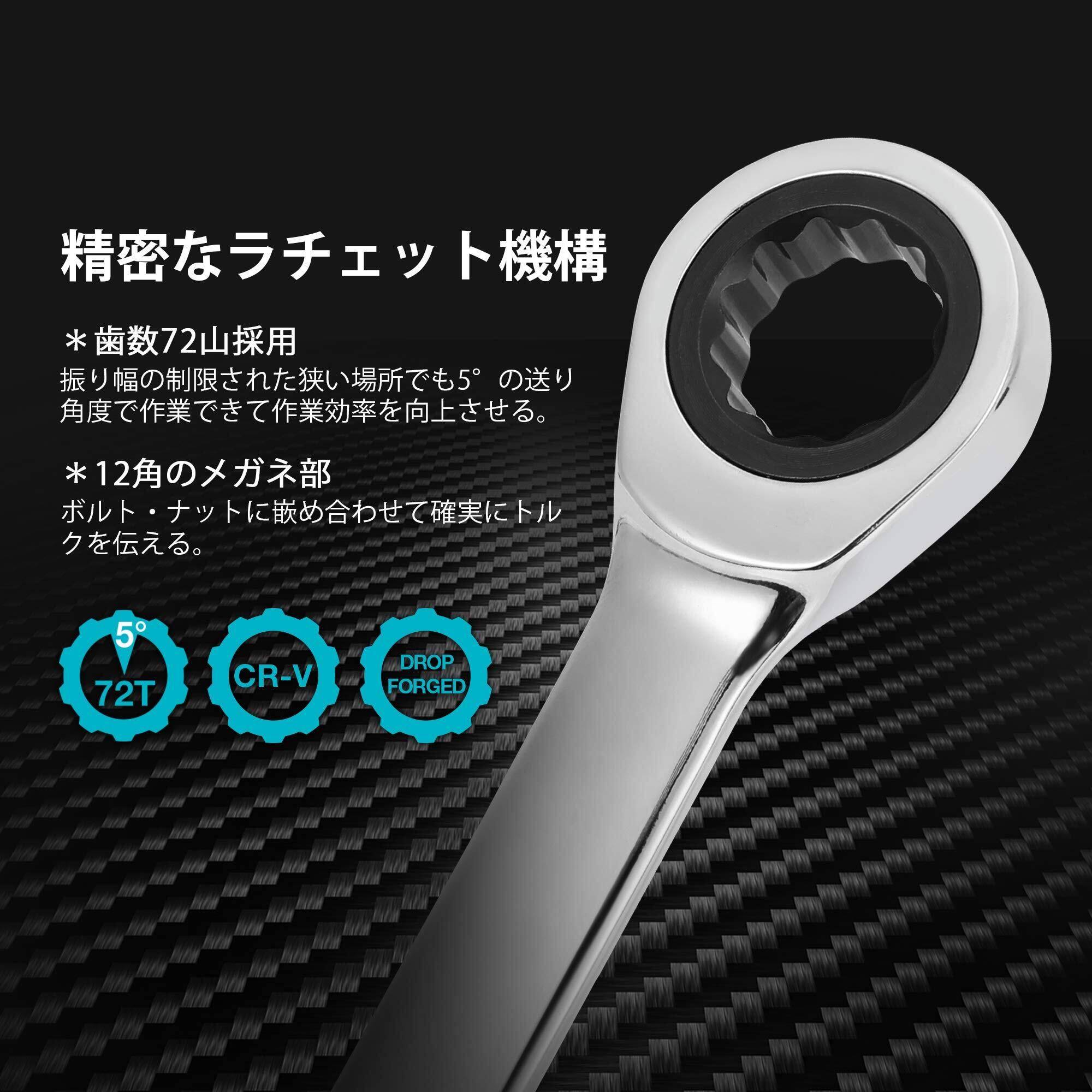 【セット内容】片側ラチェット付きメガネレンチ9本組。8mm、10mm、12mm、13mm、14mm、16mm、17mm、19mm、22mm各1点。
