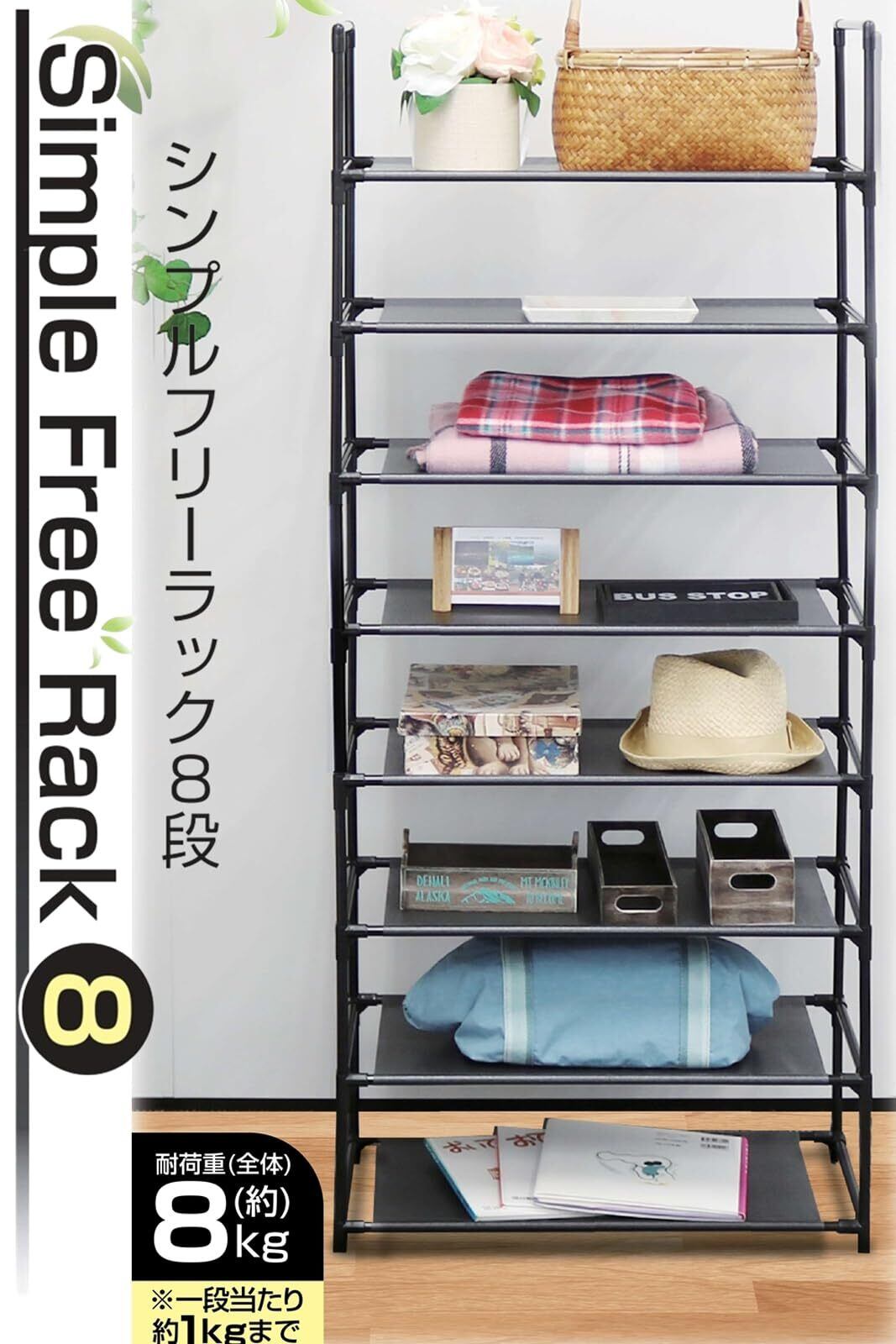 トレードワン ラック 8段 約H141×W57×D28cm オープンシェルフ 棚 高さ調整可能 スチール 軽量 組み立て簡単 シンプル 耐荷重4kg ブラック 10513