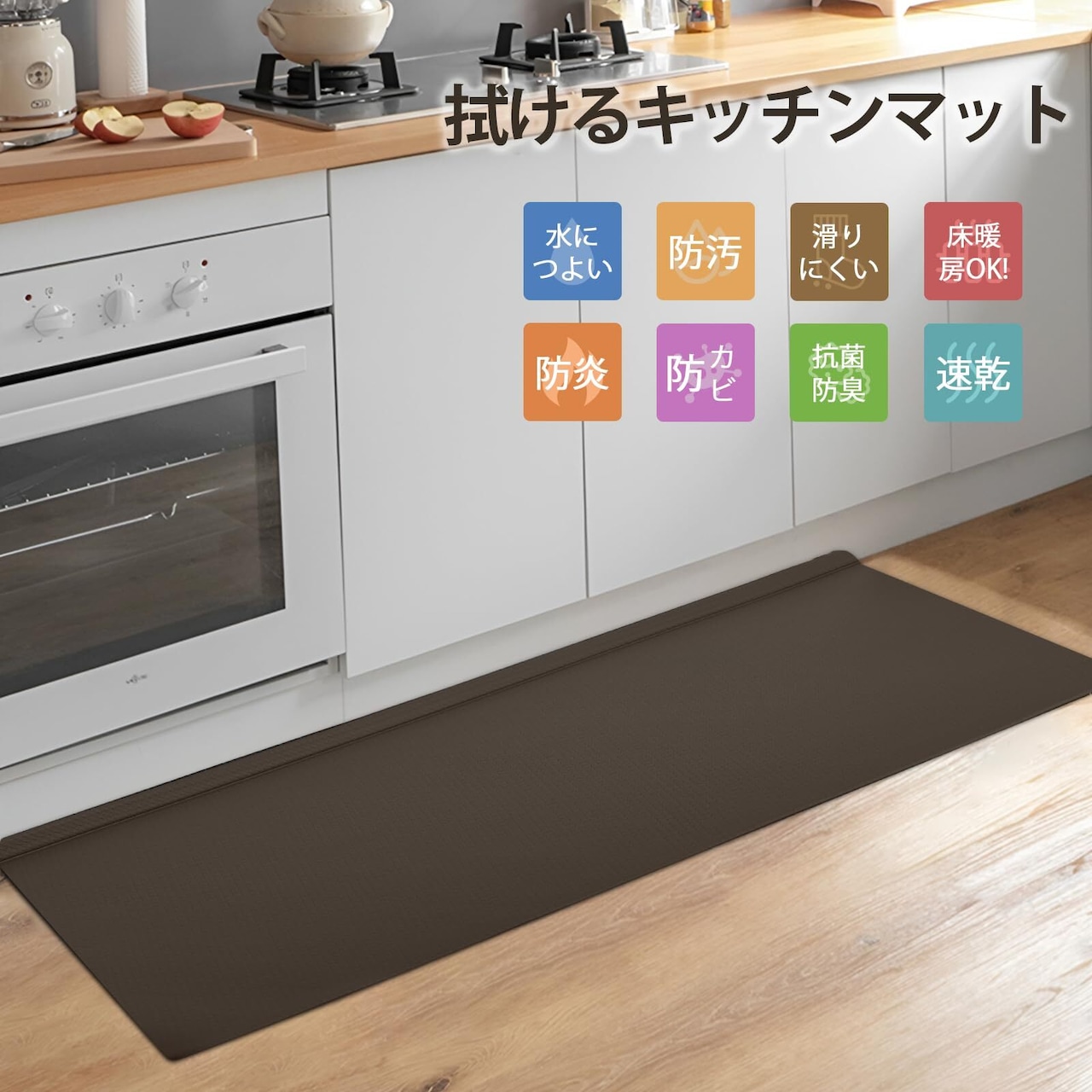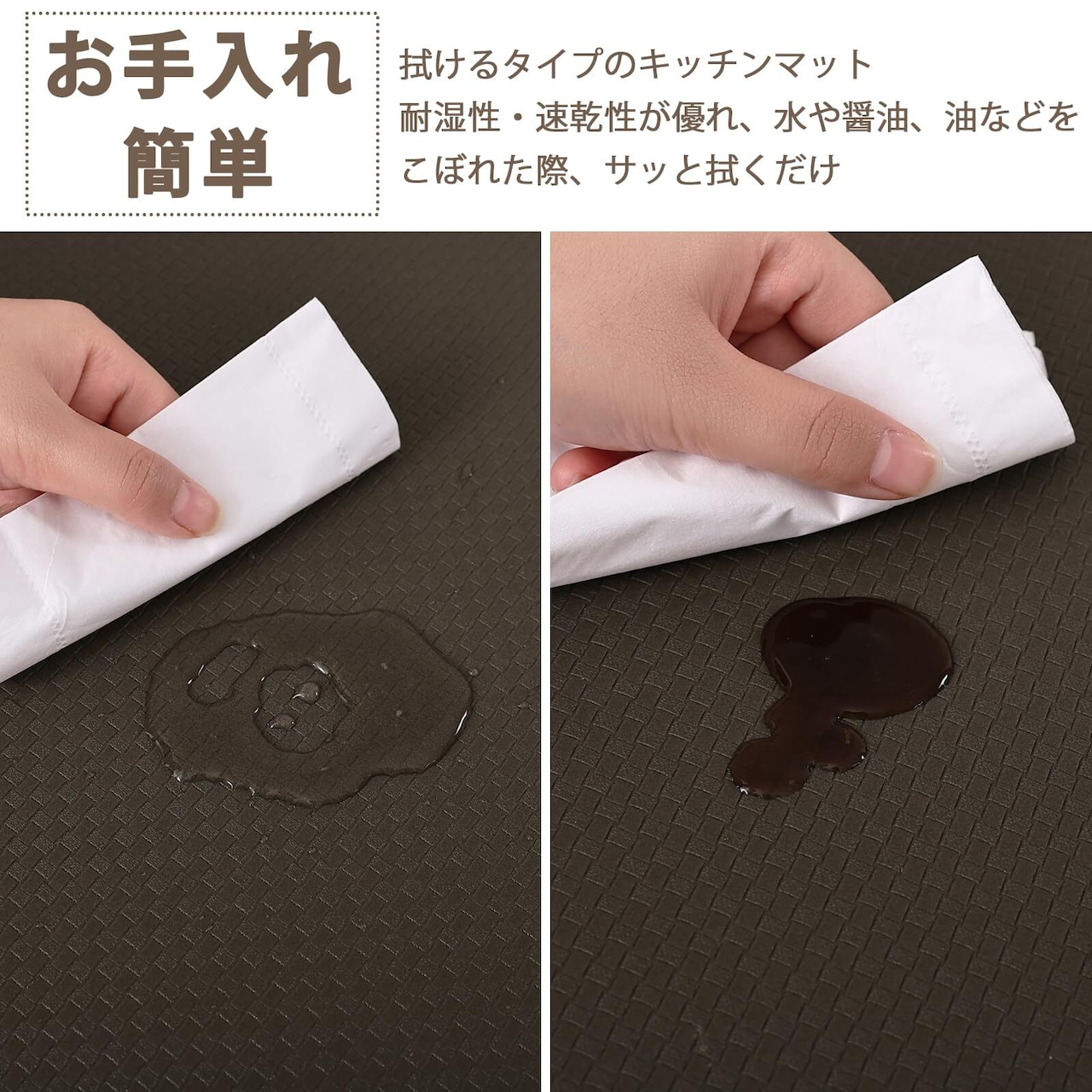 【お手入れ簡単】水に強いPVC(ポリ塩化ビニル)素材で出来上がった拭けるタイプのキッチンマットで、耐湿性・速乾性が優れ、水や調味料、油がこぼれた際、お料理しながら切った細かい物を下に落として汚れてしまう時、タオルなどでサッと拭くだけで、ストレスフリーです。お洗濯不要だから、掃除機をかければゴミも簡単に取れるので、家事時間を短縮し、水道代、電気代も節約できます。