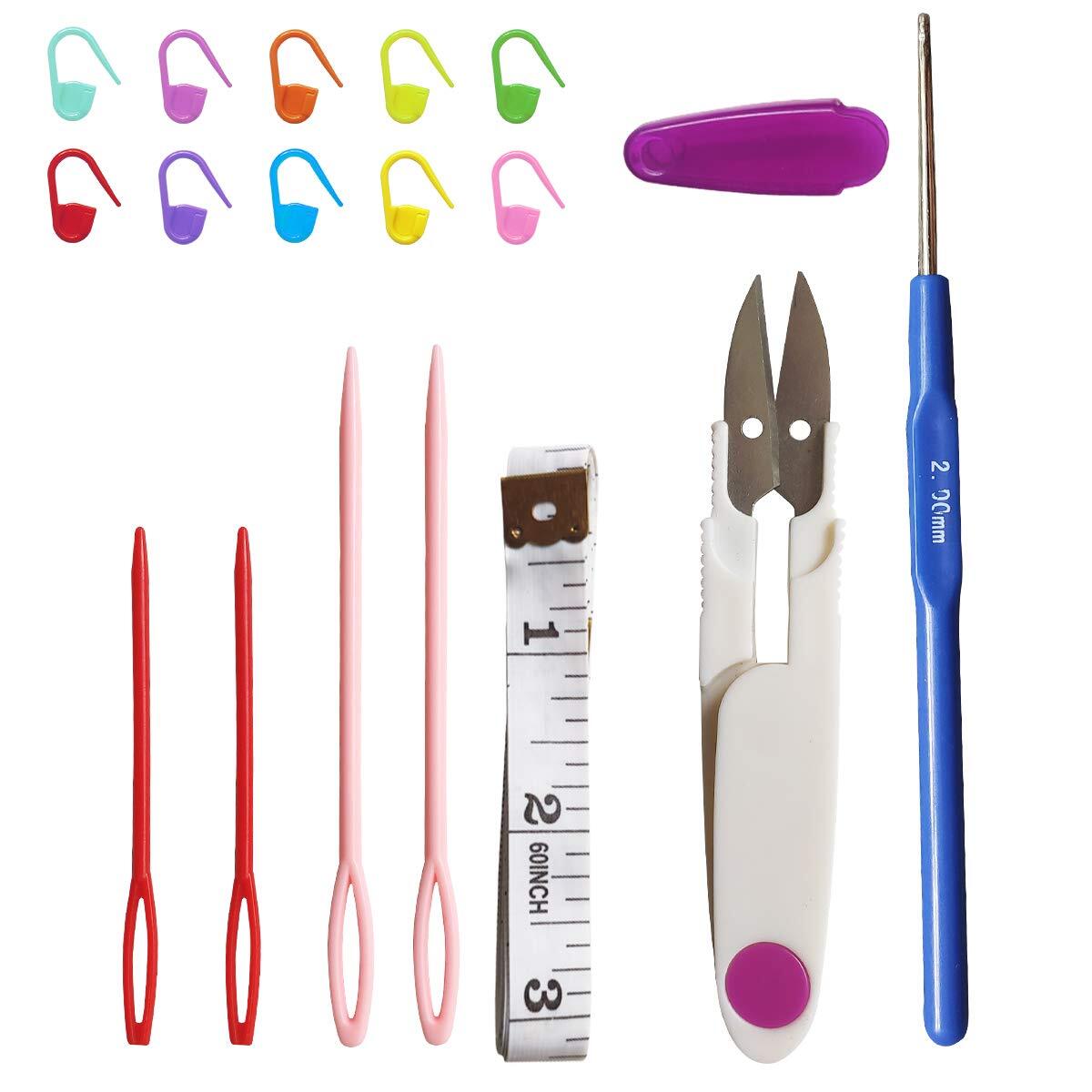 パッケージリスト:棒針x36本、レース針x1本、巻尺x1個、ハサミx1個、段数マーカーx10個、とじ針x4本。