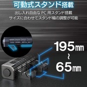 ■ノートパソコン・タブレット冷却時用スタンドを搭載し、サイズに合わせてスタンドの幅(約195~65mm)を調整可能です。(※約300(幅)×11(奥行)×200(高さ)mmまでのタブレットを設置可能です。)