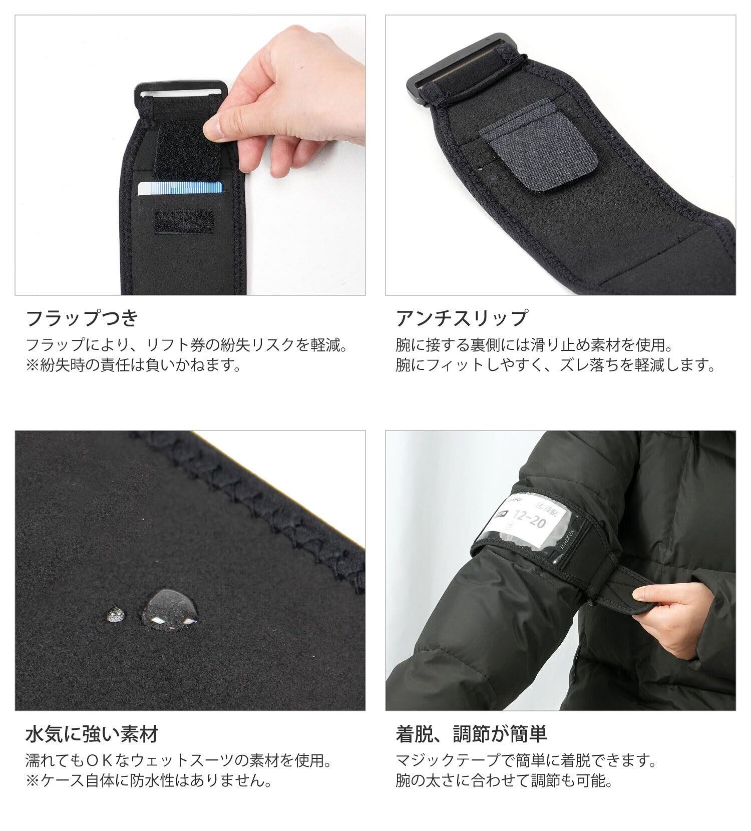 リフト券を入れることに特化したシンプルで機能的なデザインで、スキー・スノーボード時の動きも邪魔しにくい。