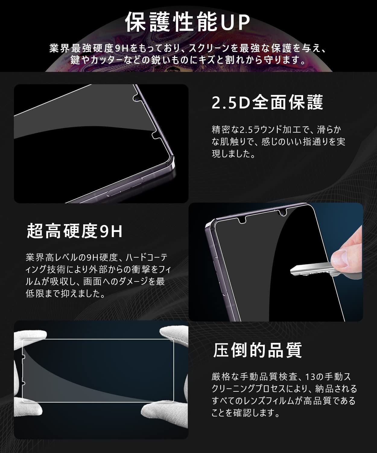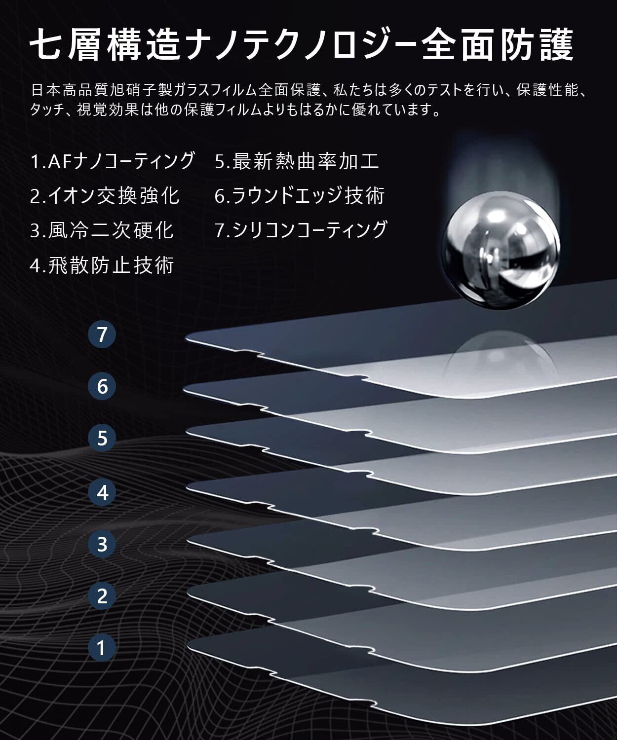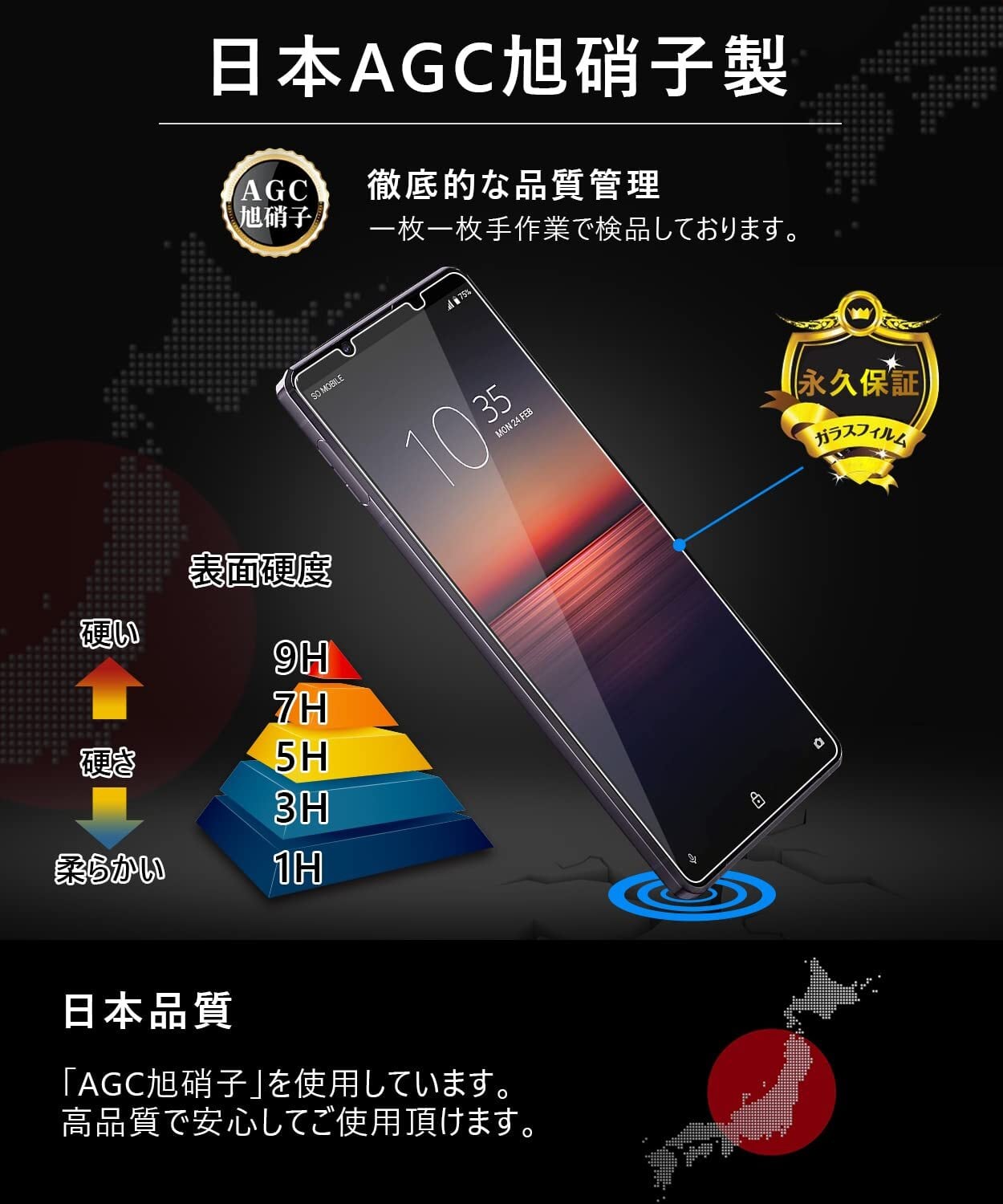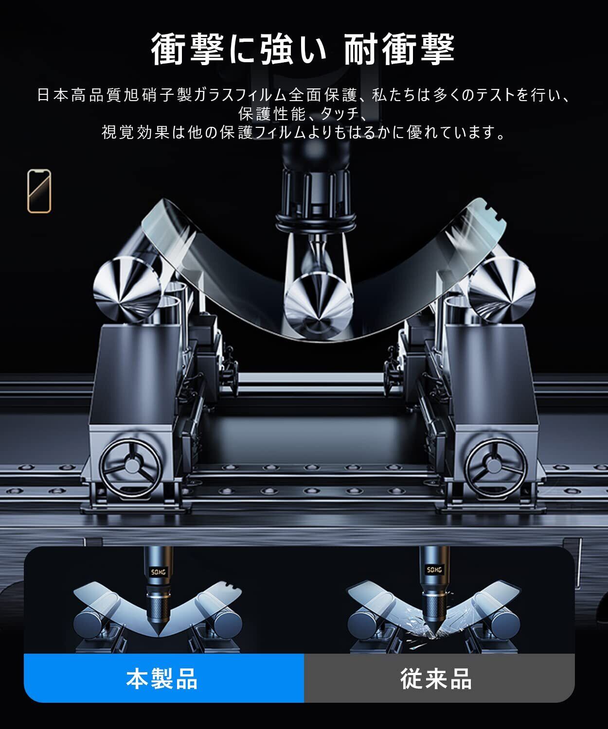 【日本製素材旭硝子製・耐衝撃性!】 日本製旭硝子素材、9H硬度、またハードコーティング技術により、強度を普通より3倍以上アップしており、液晶画面をしっかりと保護する。ハードコーティング技術により外部からの衝撃をフィルムが吸収し、画面へのダメージを最低限まで抑えました。