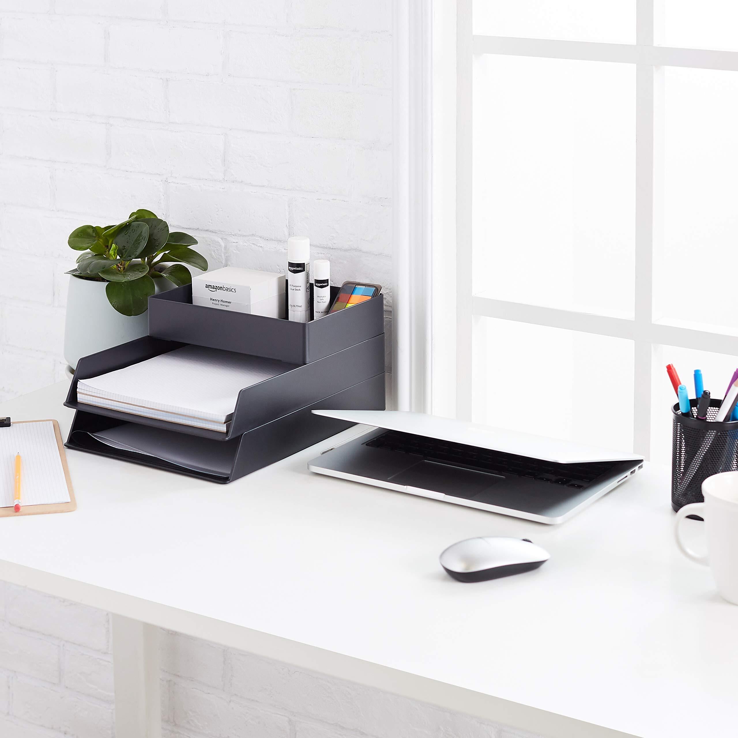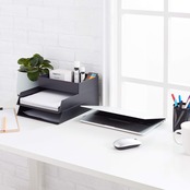 ホッチキス、テープディスペンサー、ペンホルダーなどのデスクトップアクセサリーをすっきりと収納できるアクセサリートレイ。