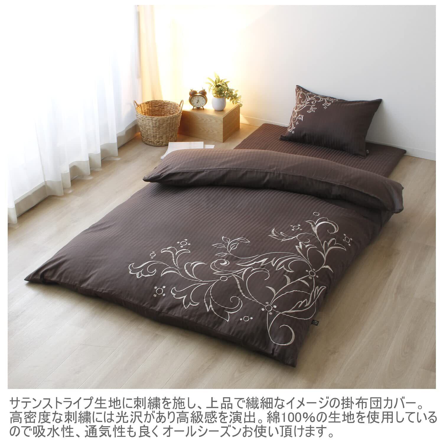 サテンストライプに刺繍を施し、上品で繊細なイメージの掛布団カバー。高密度な刺繍には光沢があり高級感を演出。サテンストライプの特長でもある上品な光沢感と滑らかな肌触りがラグジュアリー感のあるベッドルームを演出。綿100%の生地を使用し保湿性、吸水性に優れている為 オールシーズン快適にお使いいただけます。
