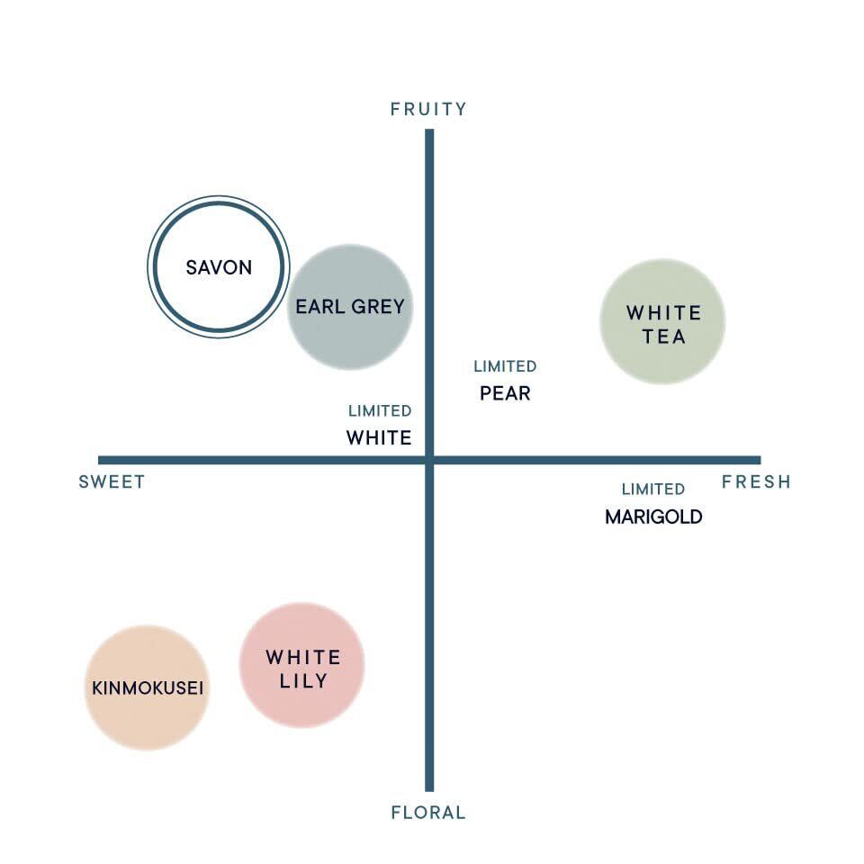 【爽やかに優しく残る甘さ】新しいサボンは、トップノートのレモン・オレンジ・ブラックカラントなどのシトラスやフルーティな香りを高め、爽やかさをプラスしています。ラストノートでは、スウィートの甘さを軽減し、サボンの香りならではのお風呂上がりのような爽やかに優しく残る甘さを、どのシーズンでもどの年代の方にもご使用いただきやすく仕上げました。香調だけでなく、製品ごとの香り立ちやテクスチャーも、よりお楽しみいただけるよう改良いたしました。