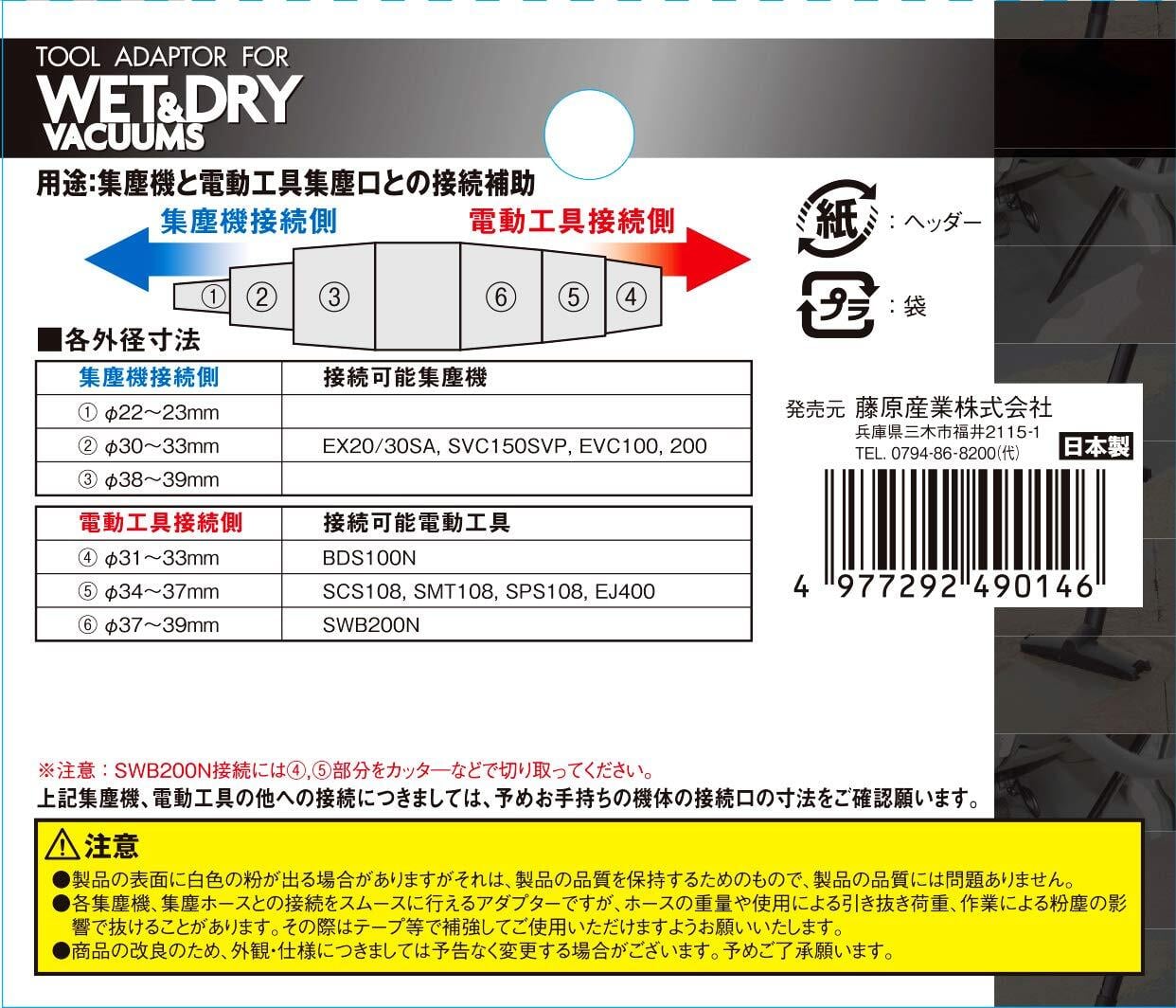 各集塵機、集塵ホースと電動工具との接続をスムースに行うためのアダプターですが、ホースの重量や使用による引き抜き荷重、作業による粉塵の影響で抜ける事があります。その際はテープ等で補強してご使用ください