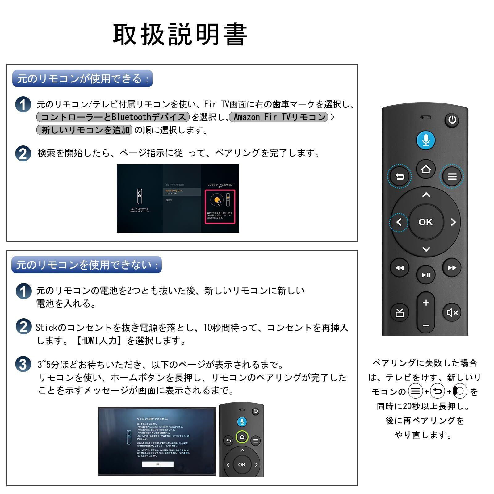 【リモコンとTV Stickのペアリングする方法】元のリモコンを持っていない/使用できない場合:1.元のリモコンの電池を2つとも抜き、新しいリモコンに新しい電池を入れる。2.ファイヤ TV Stick端末のコンセントを抜き電源を落とし、10秒間待つ。後に再度ファイヤ TV Stick端末のコンセントを入れて起動していただきます。3.再起動後、テレビ画面にファイヤ tvホーム画面が表示されます。3~5分ほどお待ちいただき、その間は何もしないで待ってください。“リモコンを検出できません”のページが表示されるまで。4.新しいリモコンを使い、ホームボタンを長押し、リモコンのペアリングが完了したことを示すメッセージが画面に表示されるまで。