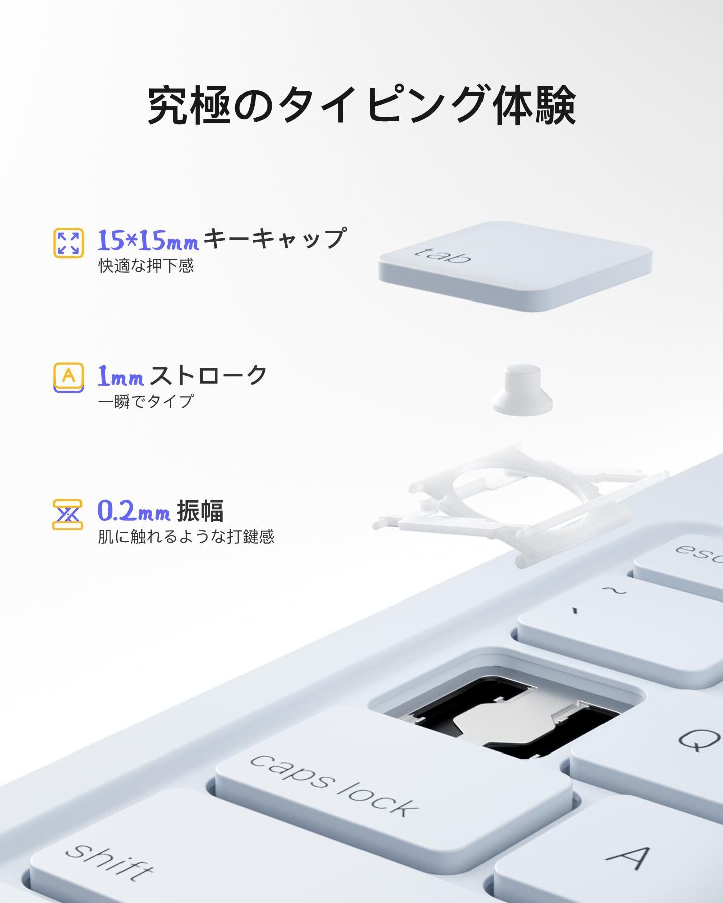 便利なショートカットキー:6行のキーで構成される革新的なキーボードは一番上の行が専用のショートカットキーです。ワンクリックで画面をロックしたり、音量を調節したりすることができ、複雑なキーコンビネーションを避けることもできます。15mm×15mmのキーは、ラップトップと同様の快適なタイピング体験を提供します