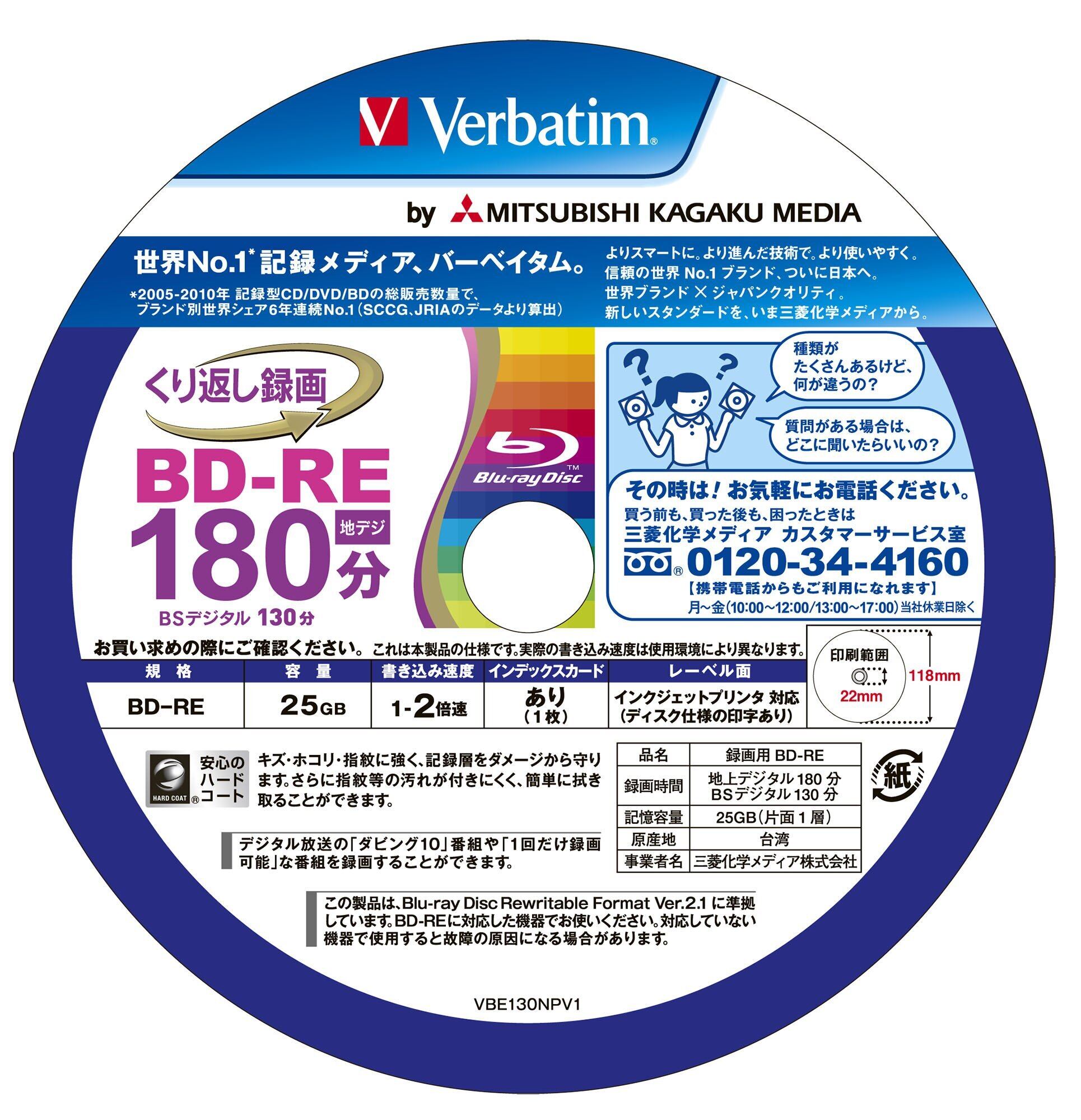 バーベイタムジャパン(Verbatim Japan) くり返し録画用 ブルーレイディスク BD-RE 25GB 20枚 ホワイトプリンタブル 片面1層 1-2倍速 VBE130NP20SV1 | ニコニコshops