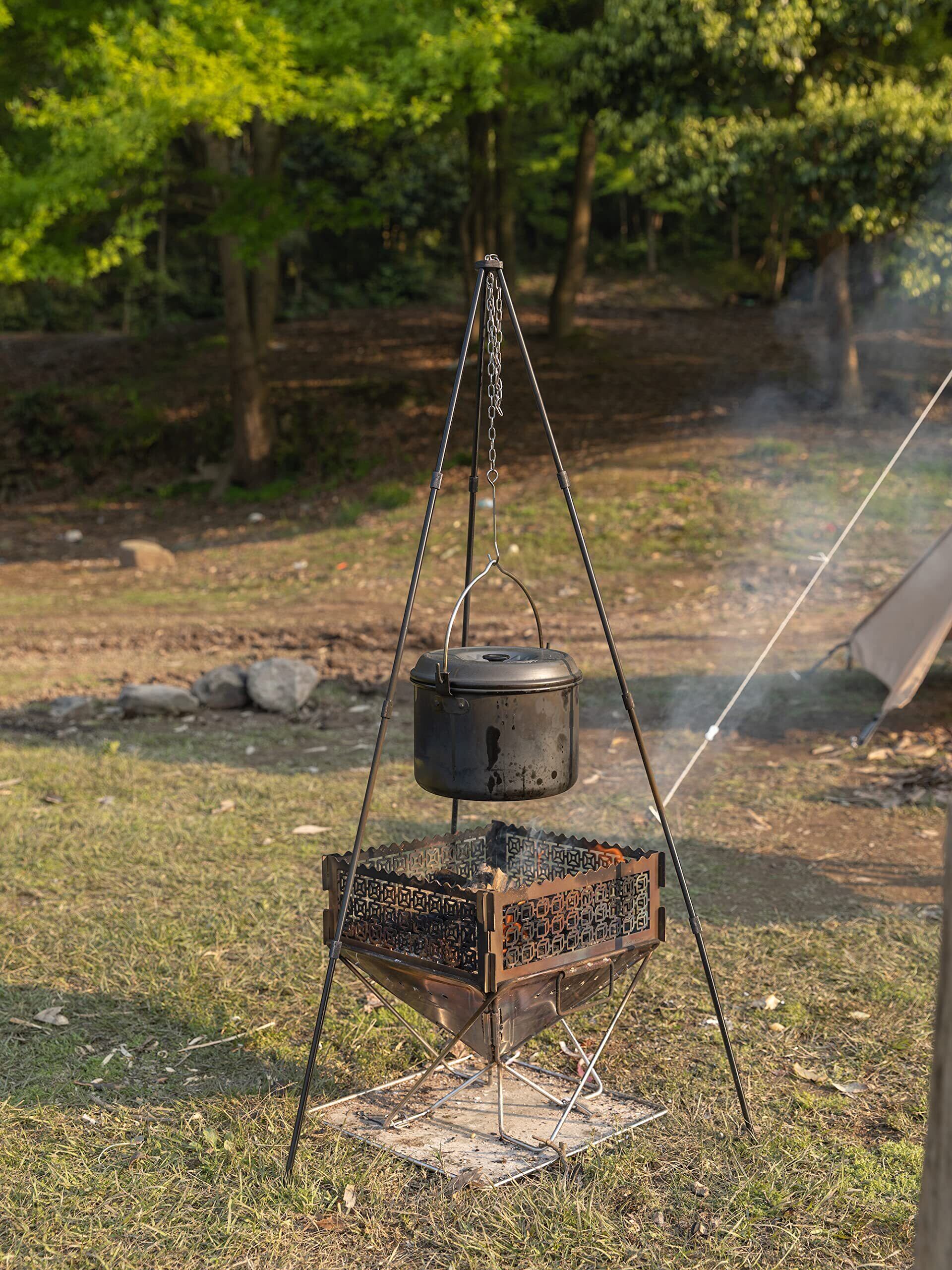 特長: ・アルミ製の軽い鍋 ・熱伝導率が高い ・吊り下げ可能なのでキャンプの焚火で料理ができる ・折りたたみハンドル