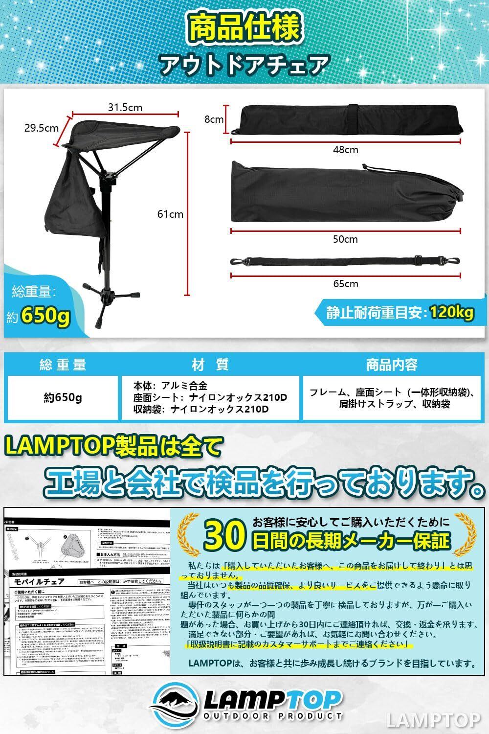 【日本語説明書・】材質:本体:アルミ合金 座面&収納袋:ナイロンオックス210D撥水加工 高さ:61cm~89cm 重量:(約)550g ▲LAMPTOP登録番号:第6548658号 アウトドアチェアは当店が販売している商品(正規品)です。 万が一、不良・故障などが発生しても購入日より30日間の安心付で、すぐに交換対応させていただきます。製品を組み立てたり使用したりする過程中どんな疑問や困難に遭遇した場合でも,タイムリーに私たちに連絡してください。これにより、操作ミスによる製品の損傷を避けることができます。【※取扱説明書に記載されているアフターサービス窓口までご連絡ください。】