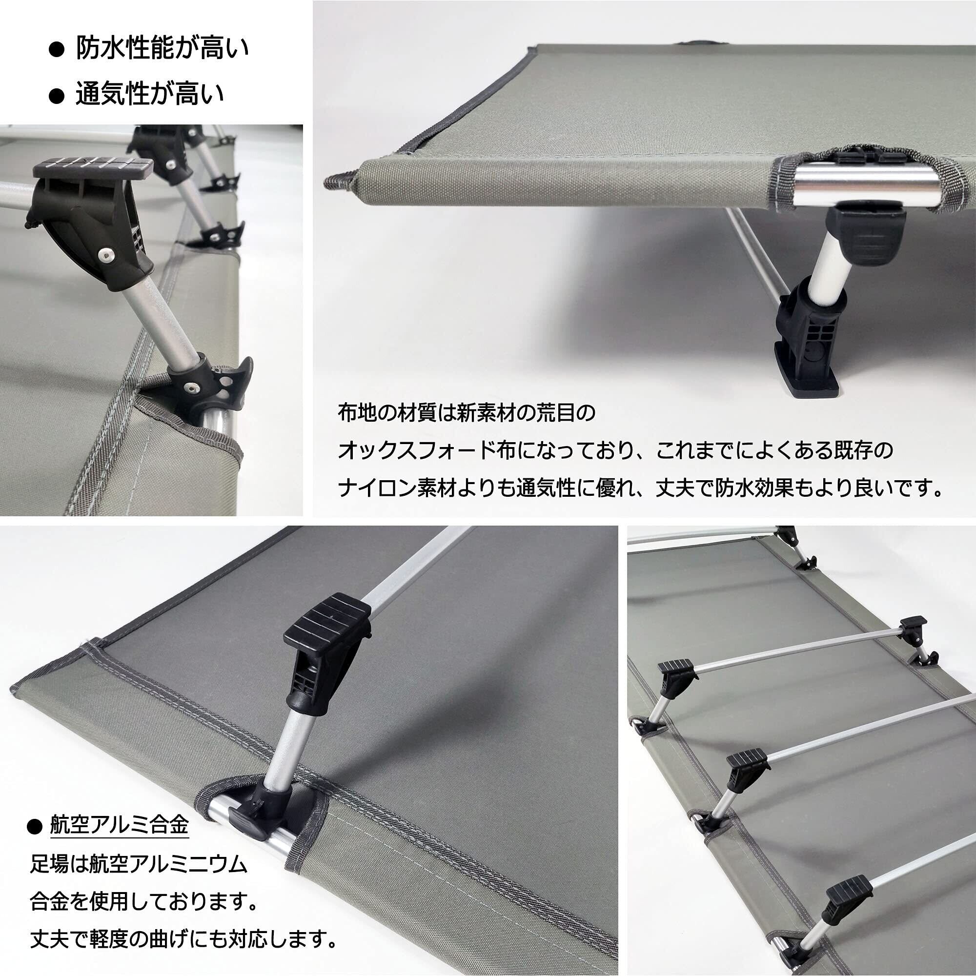 【商品仕様】使用時サイズ:(約)185cm×60cm×13cm 。収納時サイズ:(約)51cm×14cm×9cm。重量:1.9kg、耐荷重:150kg。材質:7075アルミニウム合金+600Dオックスフォード布。良質な材料を使用しており、コットの耐久性も問題ございません。
