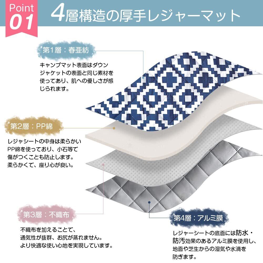 「4層構造の厚手レジャーマット」:第1層:レジャーシート表面はダウンジャケットの表面と同じ素材を使ってあり、柔らかな肌触りです。繊細な手触りで、肌への優しさが感じられます。 キャンプを楽しく過ごすことができます。第2層:ピクニックシートの中身は従来のスポンジではなく、柔らかいPP綿を使用することで、小石等で傷がつくことも防止だけでなく、より快適な使い心地を実現しています。第3層:不織布を加えることで、より耐久性のあるレジャーマットに仕上がっています。中間部のPP綿と底材が剥がれることなく、ぴったりとフィットするようになり、長い使えます。第4層:レジャーシートの底面には防水・防汚効果のあるアルミ膜を使用し、地面や芝生からの湿気や水滴を防ぎます。底面が汚れたら、湿った布で拭くときれいになります。