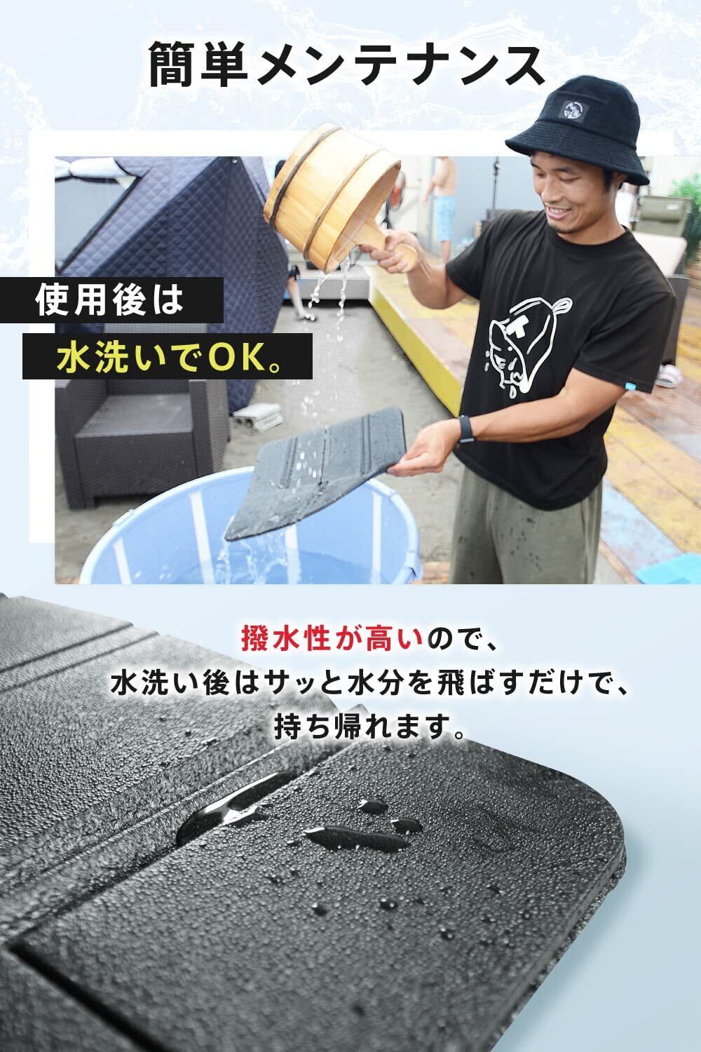 【防水撥水仕様】水を弾く特殊素材を採用しているため、この防水マットは使用後に水で流してサッと水滴を払うだけでお手入れが簡単です。サウナやレジャーシートとしての利用もスムーズです。