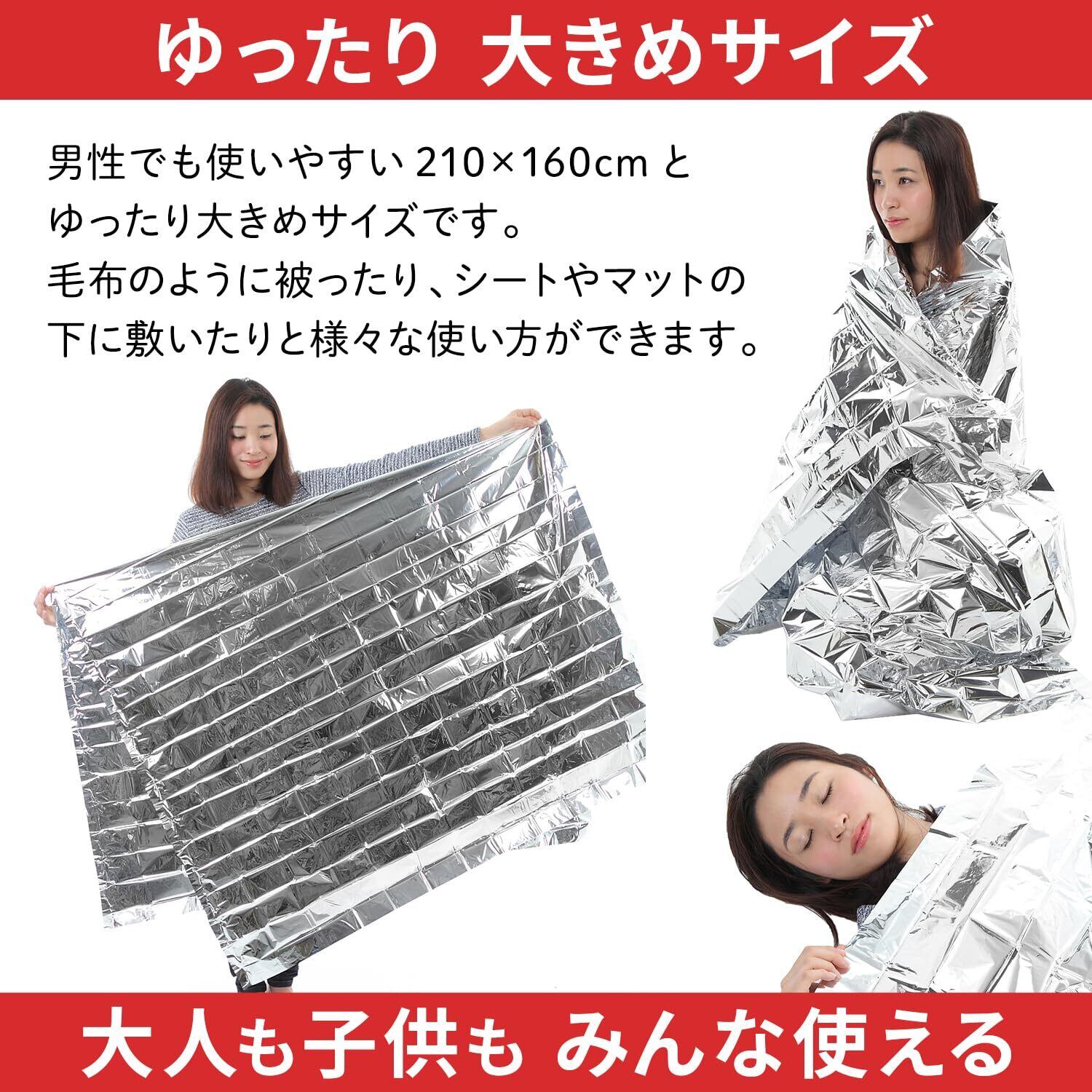 広げると約 160 × 210 cmと大きめサイズになりますので、 毛布のように被ったり、 シートやマットの下に敷いたりと様々な使い方が可能です。 パッケージはコンパクトなポケットサイズですが、いざという時にはサッと広げて 寒さをしのぐことができ大変便利です。 毛布 寝袋やレジャーシートの代わりとして体温を逃がさない目的にご使用頂けます。