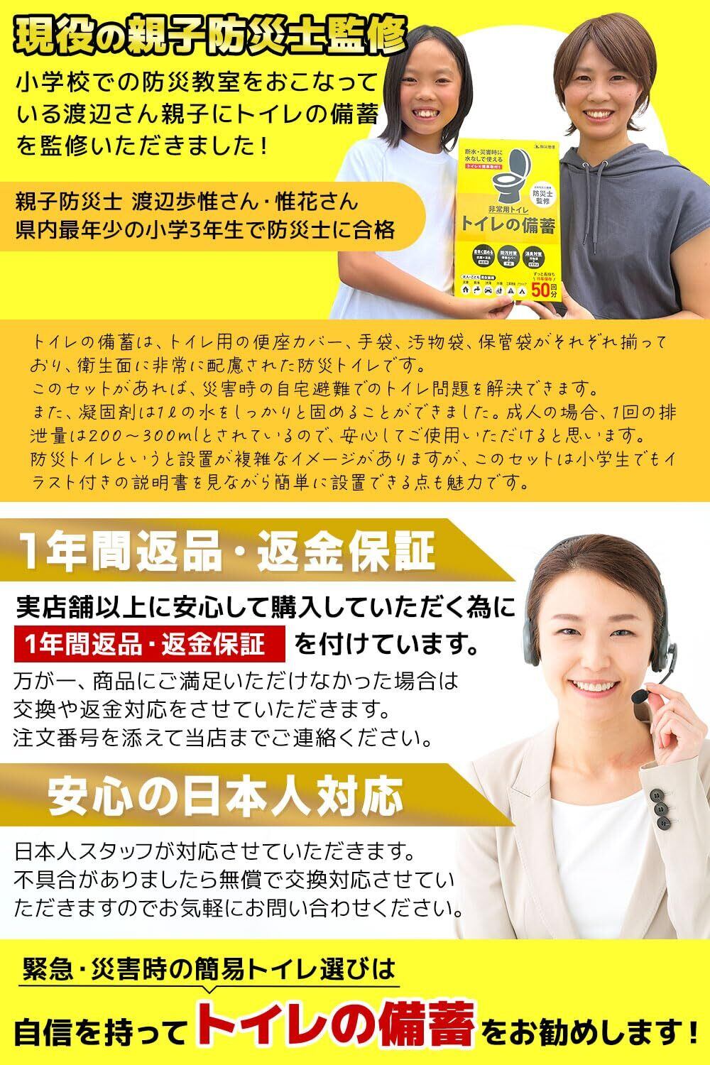 【セット内容 /メーカー】1箱に 凝固剤×50袋、汚物処理袋×50枚、便座カバー×3枚、防臭袋×5枚、衛生手袋×50枚【メーカー】本製品は日本企画の日本ブランドです。お電話でのお問合せも日本人スタッフが対応させていただきます。不具合、故障がありましたら無償で交換対応させていただきますので お気軽にお問い合わせください。