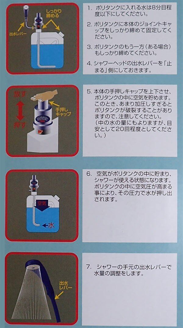 本格派シャワーヘッド採用! 市販のポリタンクに取り付けて使用します。 ペットボトルで作るロケットと同じ原理で、タンク内に圧力をかけて水を押し出す方式です。 乾電池などの電源不要なので、どんな場所使用できます。 ポリタンクの取水口のネジ部外径が50mmと65mmに対応。