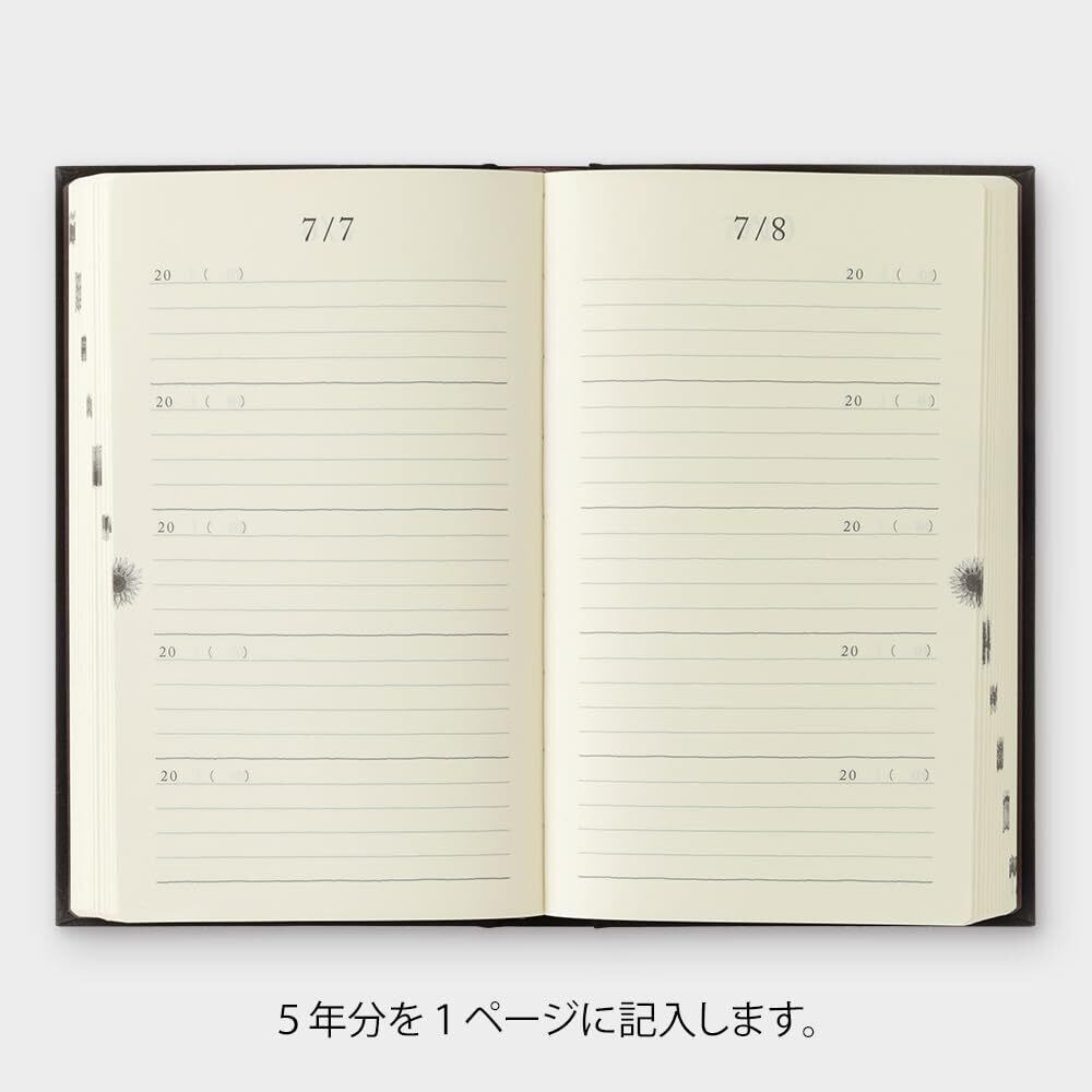 同じ日の記録を5年分一覧できる日記。去年の今日はこんなことをしていたんだ・・・、と読む楽しみ、書く楽しみが一度に味わえる。月毎に変わるインデックスイラストがおしゃれ。 本文:366ページ 罫線6mm 付録20ページ しおりひも2本