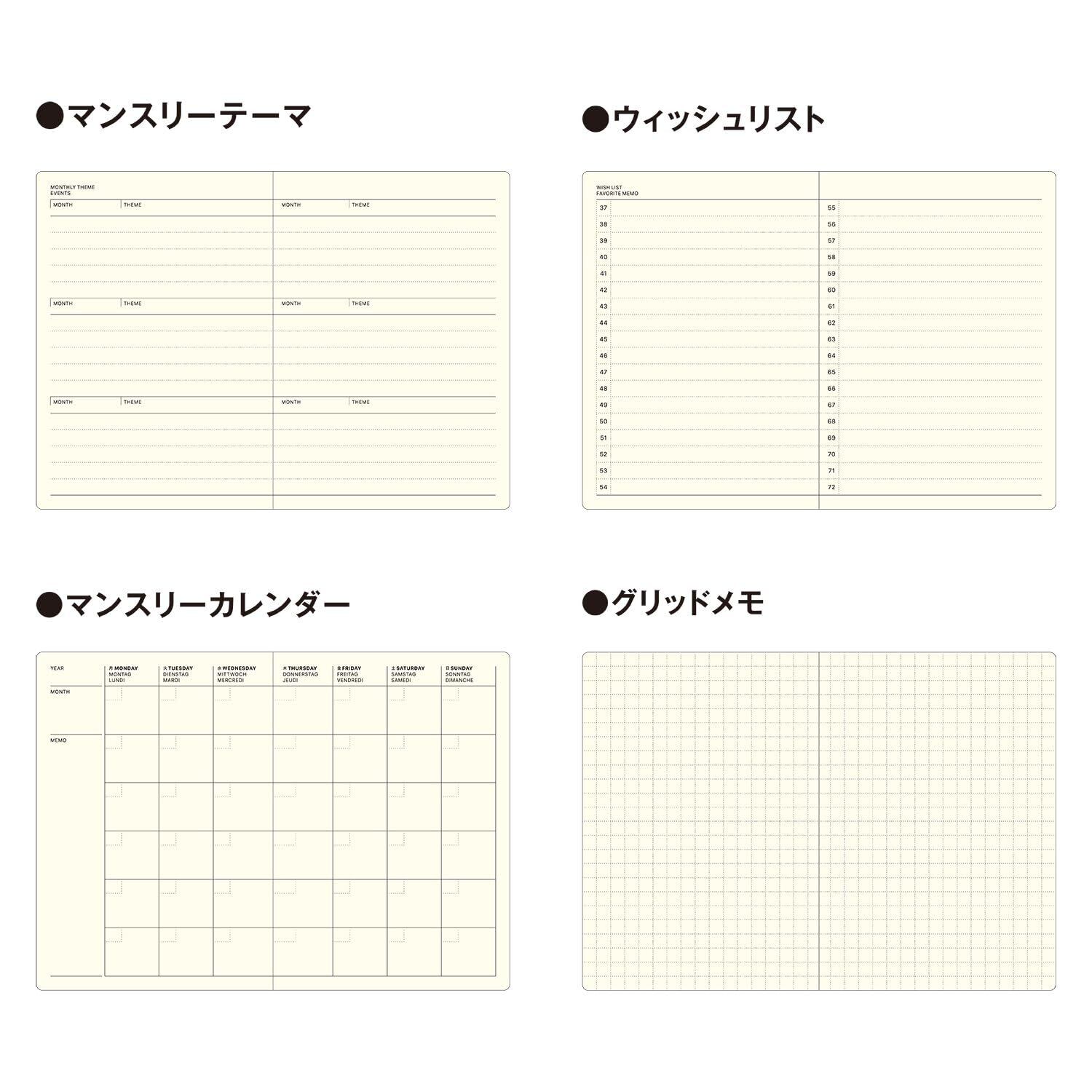 メインページ以外にマンスリーテーマ2ページ、マンスリーカレンダー12ページ(6ヶ月分)、ウィッシュリスト4ページ(72項目)、ググリッドメモ4ページを含む全208ページ構成。